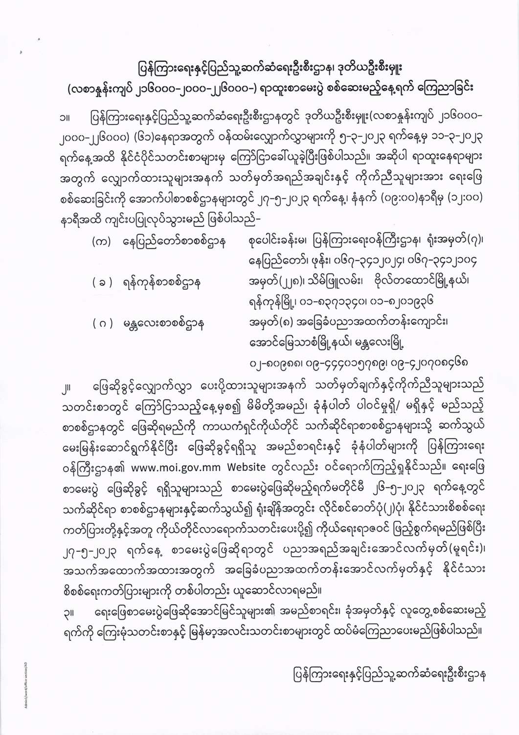 ပြန်ကြားရေးနှင့်ပြည်သူ့ဆက်ဆံရေးဦးစီးဌာန ဒုတိယဦးစီးမှူး (လစာနှုန်းကျပ် ၂၁၆၀၀၀-၂၀၀၀-၂၂၆၀၀၀) ရာထူးစာမေးပွဲ စစ်ဆေးမည့်နေ့ရက် ကြေညာခြင်း