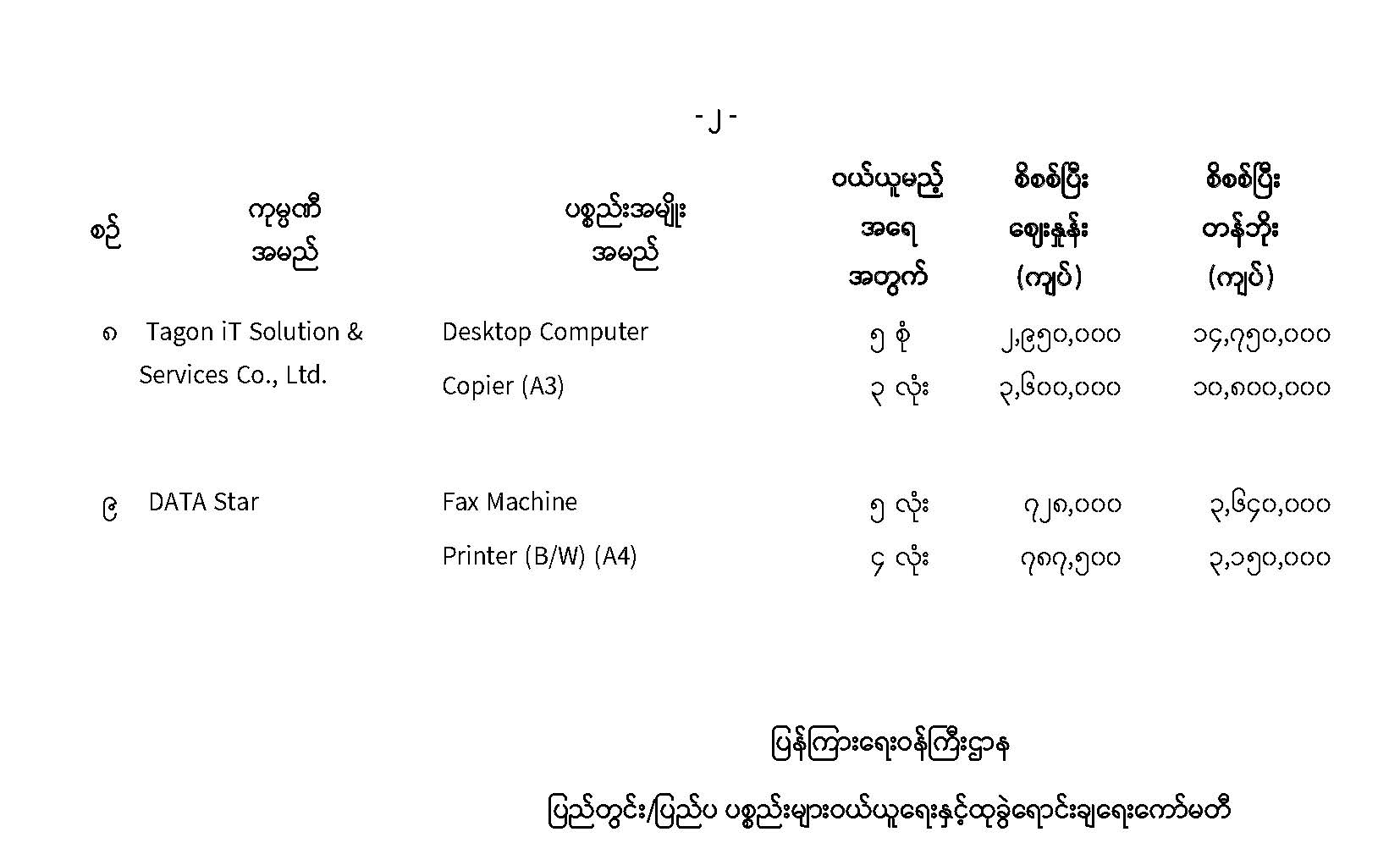 ပြန်ကြားရေးဝန်ကြီးဌာန ပြည်တွင်း/ပြည်ပ ပစ္စည်းများဝယ်ယူရေးနှင့်ထုခွဲရောင်းချရေးကော်မတီ တင်ဒါအောင်မြင်ကြောင်း ကြေညာခြင်း