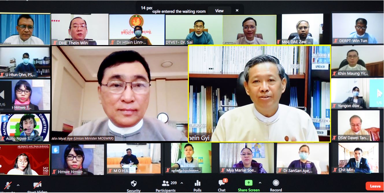 အစည်းအဝေးသို့ လူမှုဝန်ထမ်း၊ ကယ်ဆယ်ရေးနှင့် ပြန်လည်နေရာချထားရေးဝန်ကြီးဌာန ပြည်ထောင်စု ဝန်ကြီး ဒေါက်တာဝင်းမြတ်အေး၊ ပညာရေးဝန်ကြီးဌာန ပြည်ထောင်စုဝန်ကြီး ဒေါက်တာမျိုးသိမ်းကြီး၊ တိုင်းဒေသကြီး၊ ပြည်နယ် လူမှုရေးဝန်ကြီးများ၊ နေပြည်တော်ကောင်စီဝင်၊ အမြဲတမ်းအတွင်းဝန်များနှင့် ညွှန်ကြားရေးမှူးချုပ်များ၊ ဒုတိယညွှန်ကြားရေးမှူးချုပ်များ၊ မြန်မာနိုင်ငံလူငယ်ရေးရာကော်မတီဝင်များ၊ နေပြည်တော်ကောင်စီနှင့် တိုင်းဒေသကြီး/ပြည်နယ် လူငယ်ရေးရာကော်မတီဝင်များမှ တာဝန်ရှိသူများ အွန်လိုင်းဖြင့် ပါဝင်ဆွေးနွေးကြသည်။