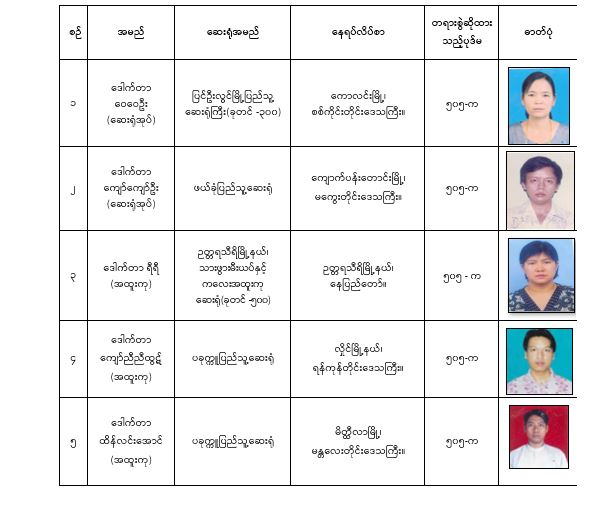 ဖော်ပြပါ ဆရာဝန်များအနက် ဗန်းမော်မြို့ ပြည်သူ့ဆေးရုံ(ခုတင်-၂၀၀)မှ ဒေါက်တာ အောင်ထွန်းဝင်း (အထူးကု)နှင့် ဒေါက်တာ ဂမ်မင်းထက် (အထူးကု) တို့သည် စွမ်းမေတ္တာဆေးရုံ၌လည်းကောင်း၊ ဗန်းမော်မြို့၊ ပြည်သူ့ဆေးရုံ(ခုတင်-၂၀၀)မှ ဒေါက်တာ လျန်းလင်းထွေး (အထူးကု)နှင့် ဒေါက်တာ ဗညား(အထူးကု)တို့သည် စိန်သေစ္စာဆေးရုံ၌လည်းကောင်း၊ ကလေးအထူးကု(လွိုင်ကော်မြို့ပြည် သူ့ဆေးရုံ)မှ ဒေါက်တာ ရန်နိုင်မိုး(အထူးကု)သည် မင်းသုခအထူးကုဆေးခန်း၌ လည်းကောင်း တာဝန် ကျရာ ဆေးရုံများတွင် ကုသခြင်းမပြုဘဲ CDM ပြုလုပ်၍ ပြင်ပပုဂ္ဂလိက ဆေးရုံ/ ဆေးခန်းများတွင် သွားရောက်ကုသလျက်ရှိကြောင်း မှတ်တမ်းဓာတ်ပုံများနှင့်အတူ အောက်ပါအတိုင်း စိစစ်တွေ့ရှိရ ပါသည်။