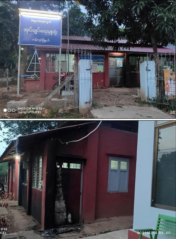 အလားတူ နံနက် ၄ နာရီအချိန်တွင် သန်လျင်မြို့နယ်၊ အုတ်ဖိုစုရပ်ကွက်၊ ရပ်ကွက်စီမံအုပ် ချုပ်ရေးအဖွဲ့ရုံး မီးလောင်နေကြောင်း သတင်းအရ လုံခြုံရေးတပ်ဖွဲ့ဝင်များနှင့် မီးသတ်တပ်ဖွဲ့ဝင်များ မှ သွားရောက်မီးငြှိမ်းသတ်ခဲ့ရာ နံနက် ၄ နာရီ ၂၀ အချိန်တွင် မီးငြိမ်းသွားခဲ့ပြီး မီးလောင်မှုကြောင့် ရုံးခန်းအတွင်းရှိ ပန်ကာ ၂ လုံး၊ TV ၂ လုံး၊ Sound Box ၂ လုံး၊ ပလက်စတစ်ထိုင်ခုံ ၇ လုံးနှင့် အခြားရုံးအသုံးအဆောင်ပစ္စည်းများ မီးလောင်ဆုံးရှုံးခဲ့ပြီး လုံခြုံရေးတပ်ဖွဲ့ဝင်များက မီးလောင်မှုနှင့်ပတ်သက်၍ စိစစ်ခဲ့ရာ အကြမ်းဖက်သူများမှ ရုံးအတွင်းဒီဇယ်လောင်း၍ မီးရှို့ခဲ့ခြင်း ဖြစ်ကြောင်း သိရသည်။