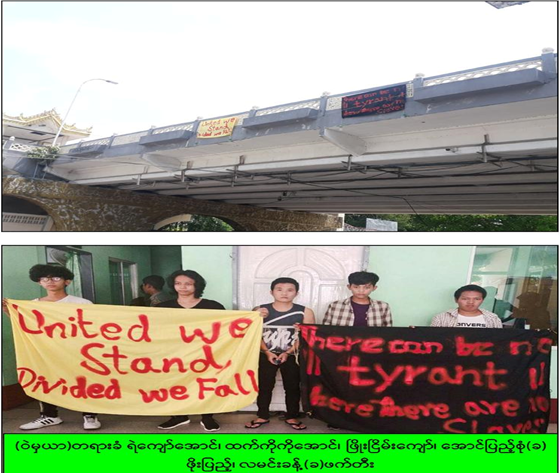 အလားတူ နံနက် ၁၁ နာရီခွဲတွင် ကျောက်တံတားမြို့နယ်၊ ပန်းဆိုးတန်းဂုန်းကျော် တံတားပေါ်၌ “United We Stand Divided We Fall” စသည့် နိုင်ငံတော်ဆန့်ကျင်ရေးစာသားပါ ပိတ်စ ၂ ခု အား ချိတ်ဆွဲနေကြောင်း သတင်းအရ လုံခြုံရေးတပ်ဖွဲ့ဝင်များပါဝင်သည့် ပူးပေါင်းအဖွဲ့က သွားရောက်စစ်ဆေးရာ သာကေတမြို့နယ်၊ အနော်မာရပ်ကွက်နေ ဖြိုးငြိမ်းကျော် (၂၇)နှစ် (ဘ) ဦးမျိုးမြင့်ပါ ၅ ဦး ကို နိုင်ငံတော်ဆန့်ကျင်ရေးစာသားပါ ပိတ်စ ၂ ခုနှင့်အတူ ဖမ်းဆီးရမိခဲ့သည်။
