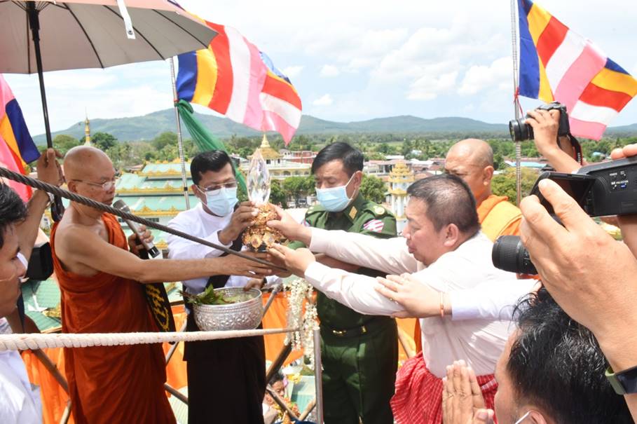 ထို့နောက် ဘုရားကြီးကျောင်းတိုက်ဆရာတော်၊ ပြည်နယ်စီမံအုပ်ချုပ်ရေး ကောင်စီဥက္ကဋ္ဌနှင့် တိုင်းမှူး တို့က ရတနာစိန်ဖူးတော်၊ ငှက်မြတ်နားတော်နှင့် ရွှေထီး တော်ဘုံအဆင့်ဆင့်တို့အား မင်္ဂလာရထားပျံဖြင့် ပင့်ဆောင်၍ စေတီတော်အထွဋ်သို့ တင်လှူပူဇော်ကာ အမွှေးနံ့သာများ ပက်ဖျန်းပြီး ဇယမင်္ဂလာ အောင်ဂါ ထာတော်များ ရွတ်ဖတ်ပူဇော်ကြပြီး ရွှေထီးတော်တင်လှူပူဇော်ပွဲအောင်မြင်ခြင်း အထိမ်း အမှတ် အဖြစ် ရတနာရွှေမိုး၊ ငွေမိုးများ ရွာသွန်းဖြိုးခဲ့ကြောင်း သတင်းရရှိသည်။