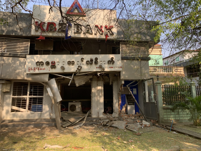 အလားတူ ဧပြီလ ၁၈ ရက်နေ့ နံနက် ၁ နာရီအချိန်တွင် မန္တလေးတိုင်းဒေသကြီး၊ တောင်သာ မြို့နယ်၊ အလယ်ချိုင့်ကျေးရွာ ရပ်ကွက်စီမံအုပ်ချုပ်ရေးအဖွဲ့မှူး ဦးစိန်ရွှေ၏ နေအိမ်အား အကြမ်း ဖက်သူလူအုပ်စုမှ မီးပုလင်းများဖြင့် ပစ်ပေါက်ထွက်ပြေးခဲ့ရာ အဆိုပါမီးပုလင်းများမှာ နေအိမ်အမိုး ပေါ်ကျရောက်ပေါက်ကွဲ မီးလောင်ခဲ့ပြီး ဝိုင်းဝန်းငြှိမ်းသတ်မှုကြောင့် နံနက် ၁ နာရီ ၁၀ မိနစ်အချိန် တွင် မီးငြိမ်းသွားခဲ့ပြီး မီးလောင်မှုကြောင့် နေအိမ်နောက်ဖေး အမိုးအနည်းငယ် မီးလောင်ပျက်စီးခဲ့ ကြောင်း သိရှိရသည်။ ထို့အတူ ယနေ့ညနေပိုင်းတွင် မန္တလေးတိုင်းဒေသကြီး၊ မြင်းခြံမြို့နယ်၊ အမှတ်(၁၃)ရပ်ကွက်၊ ဗိုလ်ချုပ်လမ်းရှိ မြင်းခြံ KBZ mini Bank ၁ အား လက်လုပ်မိုင်းဖြင့် လာရောက် ပစ်ခတ်ခဲ့ခြင်းကြောင့် ဘဏ်ရှေ့ အလူမီနီယမ် လိပ်တံခါးဆိုင်းဘုတ်၊ အဝင်ဝ မျက်နှာ ကျက်၊ ATM စက်ခန်းမှန်တံခါး၊ အုတ်နံရံများ ပြိုကျပျက်စီး၊ မှန်တံခါးများ ကွဲအက်ခဲ့ကြောင်း သိရှိရ သည်။