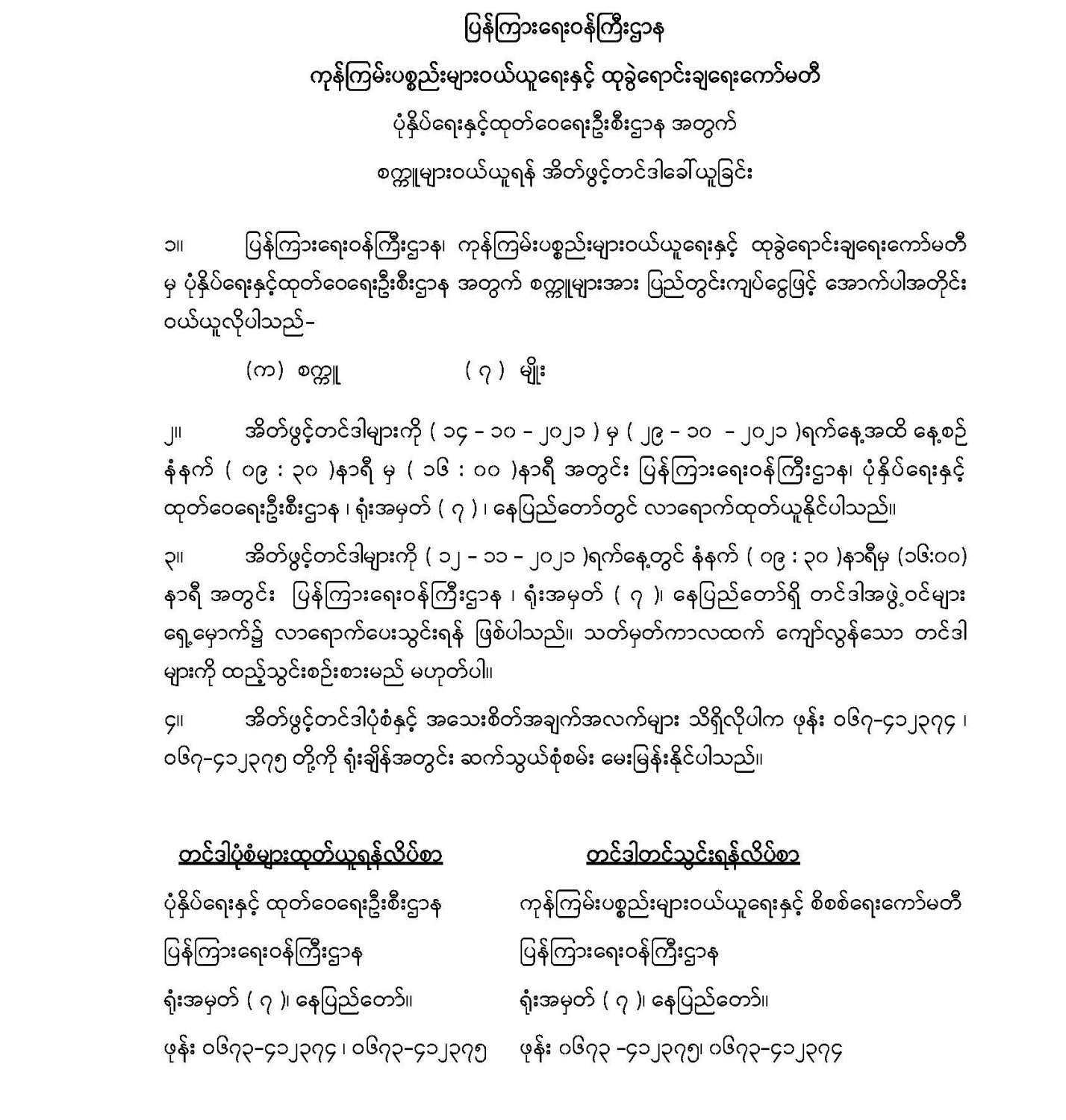 ပြန်ကြားရေးဝန်ကြီးဌာန ကုန်ကြမ်းပစ္စည်းများဝယ်ယူရေးနှင့် ထုခွဲရောင်းချရေးကော်မတီ ပုံနှိပ်ရေးနှင့်ထုတ်ဝေရေးဦးစီးဌာနအတွက် စက္ကူများဝယ်ယူရန် အိတ်ဖွင့်တင်ဒါခေါ်ယူခြင်း 09/13/2021 နေပြည်တော်