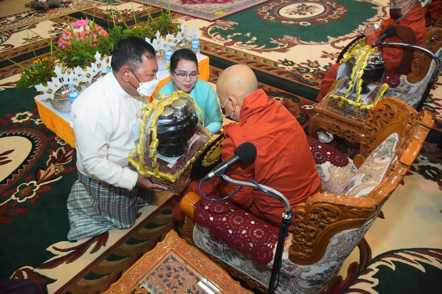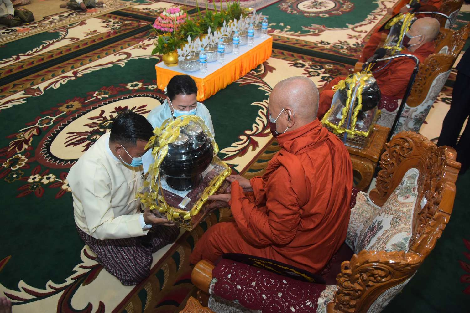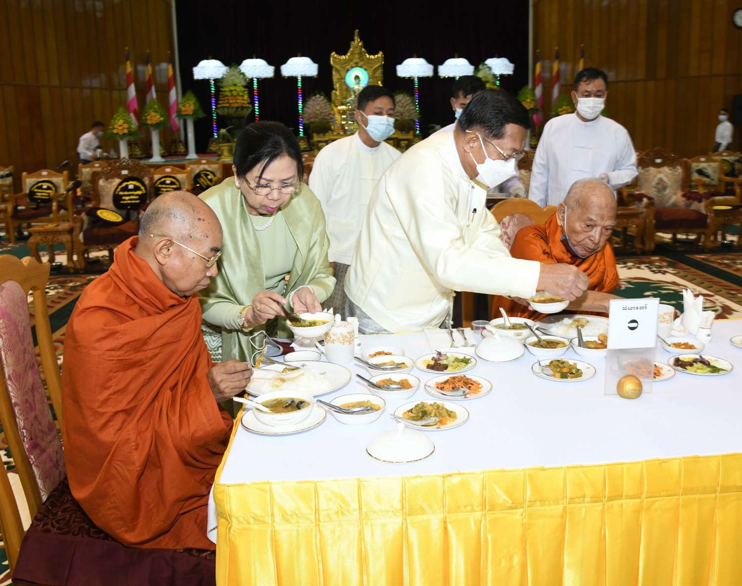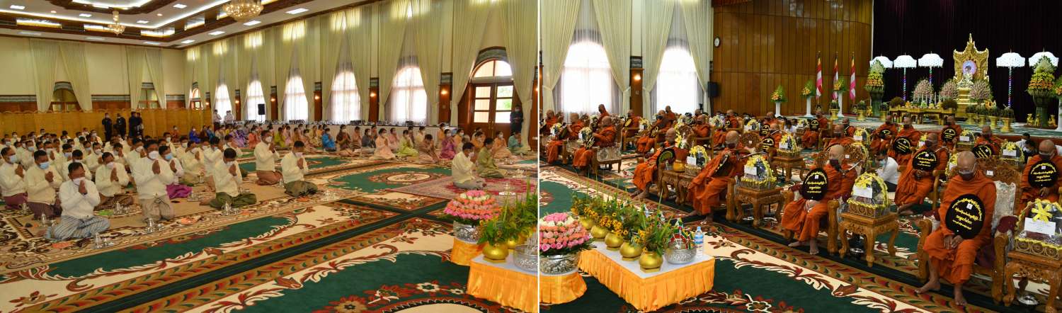 ဦးစွာ နိုင်ငံတော်စီမံအုပ်ချုပ်ရေးကောင်စီဥက္ကဋ္ဌ တပ်မတော်ကာကွယ်ရေးဦးစီးချုပ်နှင့်ဇနီးတို့က အနော်ရထာခန်းမအတွင်းရှိ ဗုဒ္ဓရုပ်ပွားတော်မြတ်အား ဖူးမြော်ကြည်ညို၍ မြသပိတ်ဆွမ်းတော်နှင့် ပန်း၊ ရေချမ်း၊ ဆီမီးတို့ကို ဆက်ကပ်လှူဒါန်းသည်။