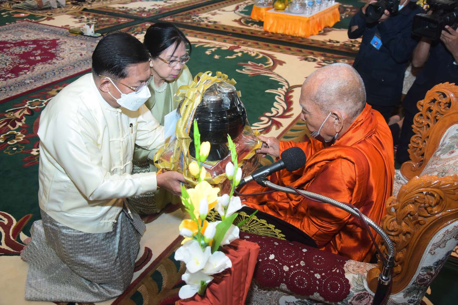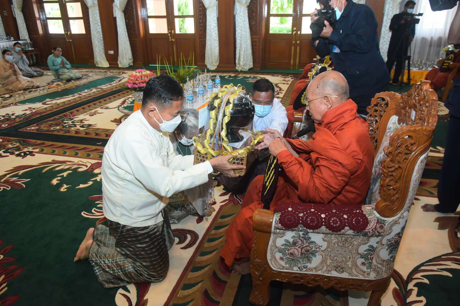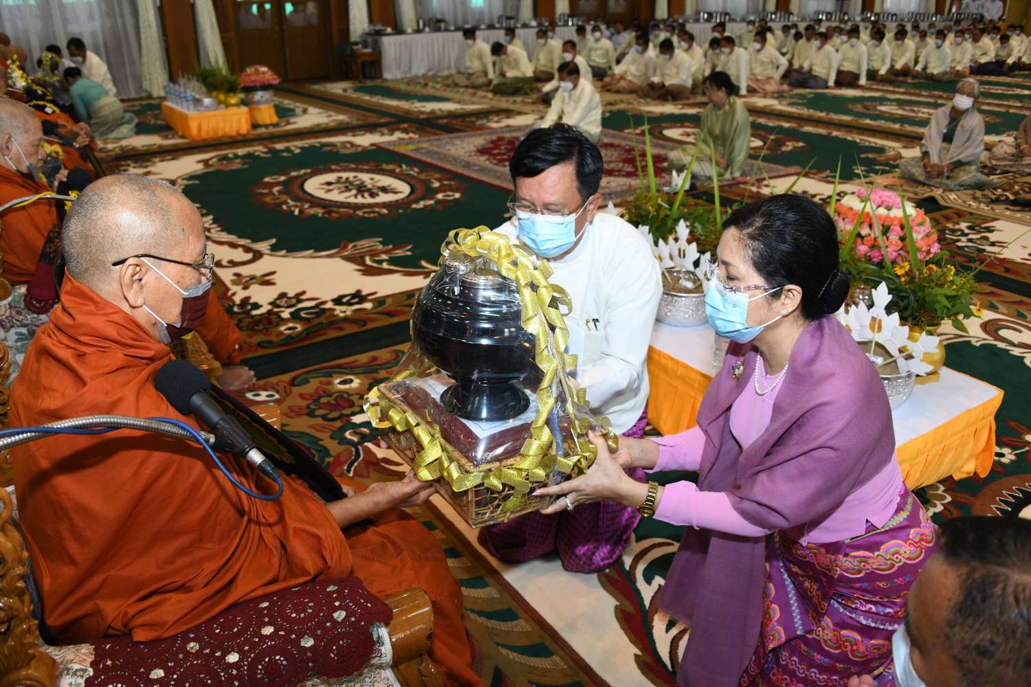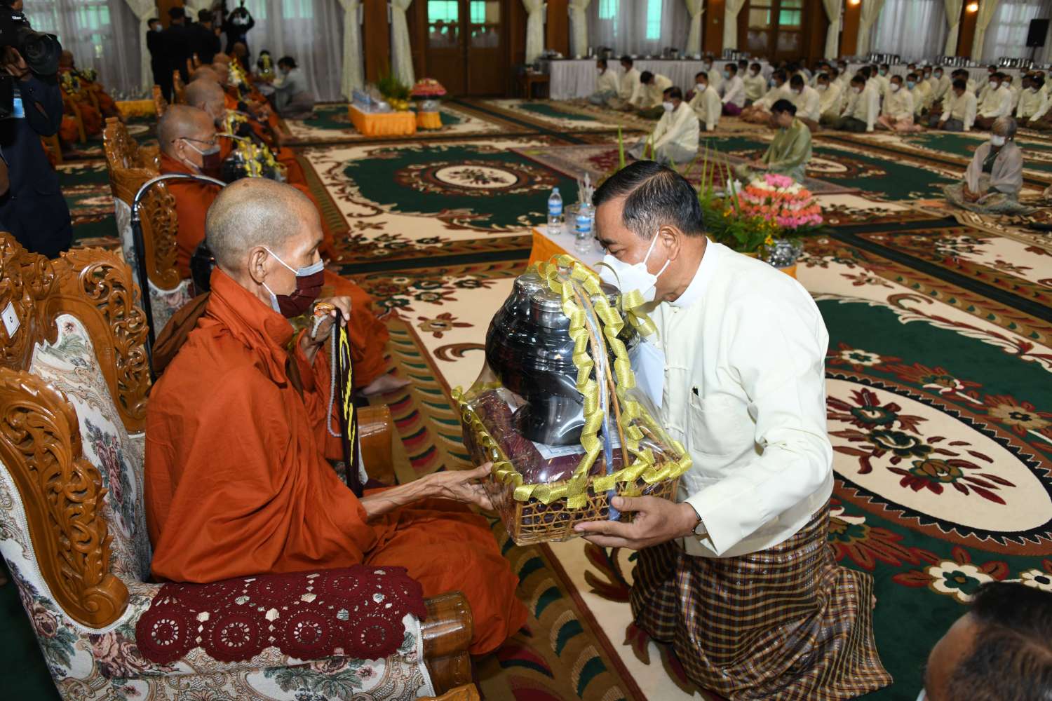 ၂၀၂၂ ခုနှစ်၊ ကာကွယ်ရေးဦးစီးချုပ်ရုံး (ကြည်း၊ ရေ၊ လေ) မိသားစုများ ဝါဆိုသင်္ကန်း ဆက်ကပ်လှူဒါန်းပွဲ မဟာမင်္ဂလာအခမ်းအနားကို ယနေ့နံနက်ပိုင်းတွင် ကာကွယ်ရေးဦးစီးချုပ်ရုံး (ကြည်း)၊ အနော်ရထာခန်းမ၌  ကျင်းပပြုလုပ်ရာ နိုင်ငံတော်စီမံအုပ်ချုပ်ရေးကောင်စီဥက္ကဋ္ဌ တပ်မတော်ကာကွယ်ရေးဦးစီးချုပ် ဗိုလ်ချုပ်မှူးကြီး မင်းအောင်လှိုင်နှင့်ဇနီး ဒေါ်ကြူကြူလှ တို့ တက်ရောက်ကြည်ညို၍ ဝါဆိုသင်္ကန်း၊ လှူဖွယ်ပစ္စည်းများနှင့် နေ့ဆွမ်းတို့ကို ဆက်ကပ်လှူဒါန်းသည်။