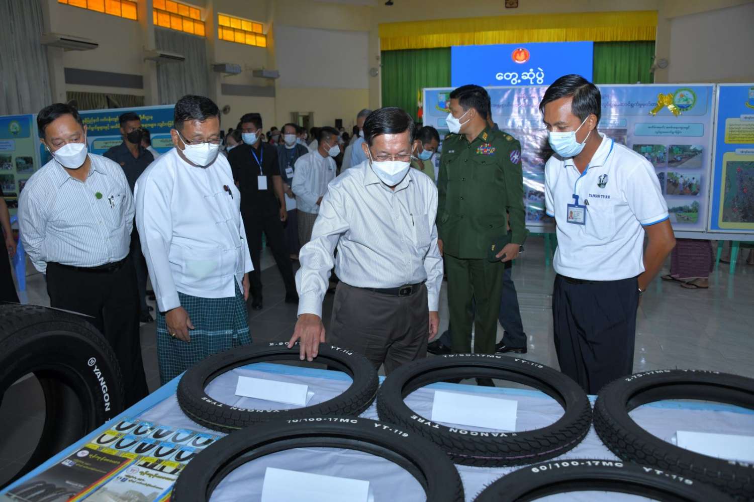 ထို့နောက် နိုင်ငံတော်စီမံအုပ်ချုပ်ရေးကောင်စီဥက္ကဋ္ဌ နိုင်ငံတော်ဝန်ကြီးချုပ်သည် ခင်းကျင်းပြသထားသည့် စားသောက်ကုန်၊ လူသုံးကုန်၊ စက်မှုလက်မှုထုတ်ကုန်၊ ဒေသရိုးရာလက်မှုထုတ်ကုန်များ၊ အဝတ်အထည်များ၊ တိုင်းရင်းဆေးများ စသည့် ထုတ်ကုန်ပစ္စည်းများ ခင်းကျင်းပြသထားရှိမှုများကို ပြကွက်တစ်ခုချင်းစီအလိုက် စိတ်ဝင်တစားဖြင့်လေ့လာခဲ့ပြီး ဈေးကွက်ရရှိမှုအခြေအနေများကို မေးမြန်းဆွေးနွေးရာ လုပ်ငန်းအလိုက် စီးပွားရေးလုပ်ငန်းရှင်များက လိုက်လံရှင်းလင်းတင်ပြခဲ့ကြကြောင်း သတင်းရရှိသည်။