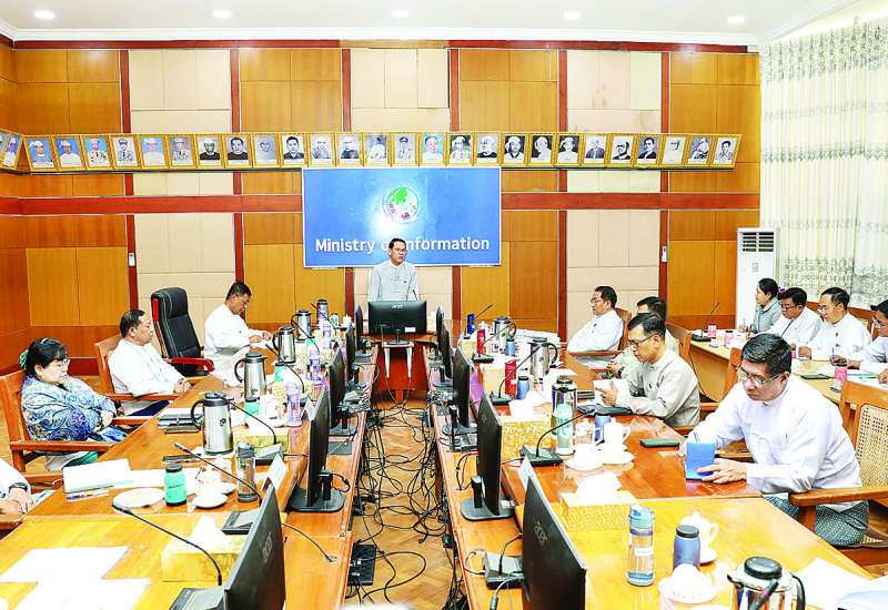 ဦးစွာ ပြည်ထောင်စုဝန်ကြီးအား ရှင်းလင်းဆောင်ခန်းမ၌ ပုံနှိပ်ရေးနှင့်ထုတ်ဝေရေးဦးစီးဌာန ညွှန်ကြားရေးမှူးချုပ်နှင့် စာဆိုဗိမာန်ကို တာဝန်ယူတည်ဆောက်နေသည့် Myanmar Land & Development Ltd Project Director တို့က စာဆိုဗိမာန် အဆောက်အအုံ ၅၂ ရာခိုင်နှုန်း တည်ဆောက်ပြီးစီးနေမှု အခြေအနေများနှင့်စပ်လျဉ်း၍ ရှင်းလင်း တင်ပြကြသည်။