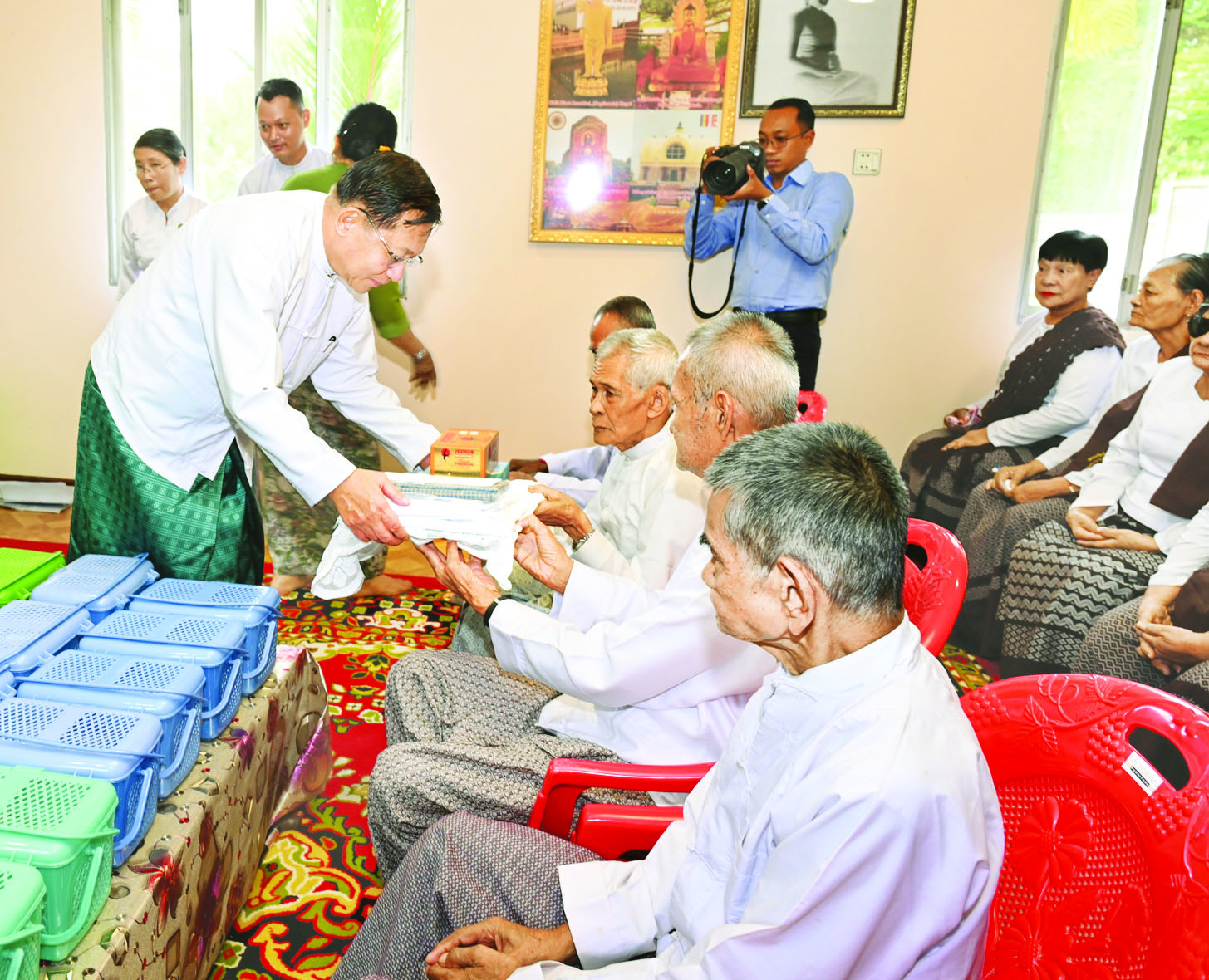 ထို့နောက် ယာယီသမ္မတ နိုင်ငံတော်လုံခြုံရေးနှင့် အေးချမ်းသာယာရေးကော်မရှင်ဥက္ကဋ္ဌနှင့် ဇနီး၊ အဖွဲ့ဝင်များသည် ထားဝယ်မြို့ဘိုးဘွားရိပ်သာသို့ ရောက်ရှိကြပြီး ဘိုးဘွားများအား ဂါရဝပြုကန်တော့ကာ အာဟာရဖြည့်ငှက်သိုက်များနှင့် စားသောက်ဖွယ်ရာများ၊ အဝတ်အထည်များကို ပေးအပ်လှူဒါန်းသည်။ ယင်းနောက်ဘိုးဘွားများ၏ ကျန်းမာရေးအခြေအနေများအား မေးမြန်းကာ ရင်းရင်းနှီးနှီးနှုတ်ဆက်သည်။