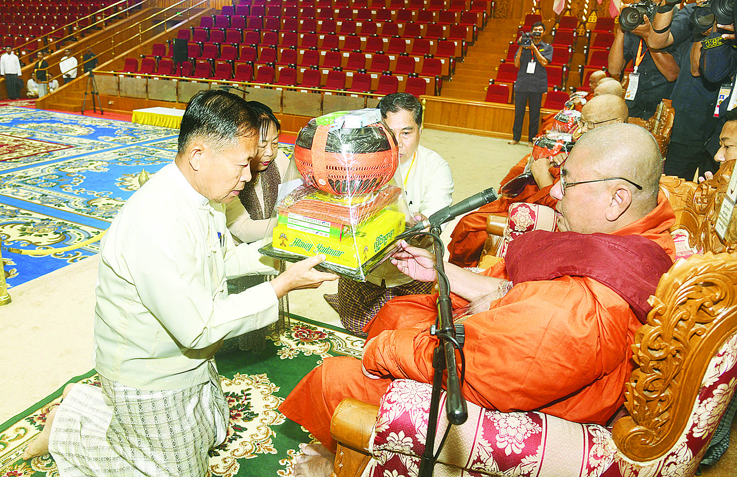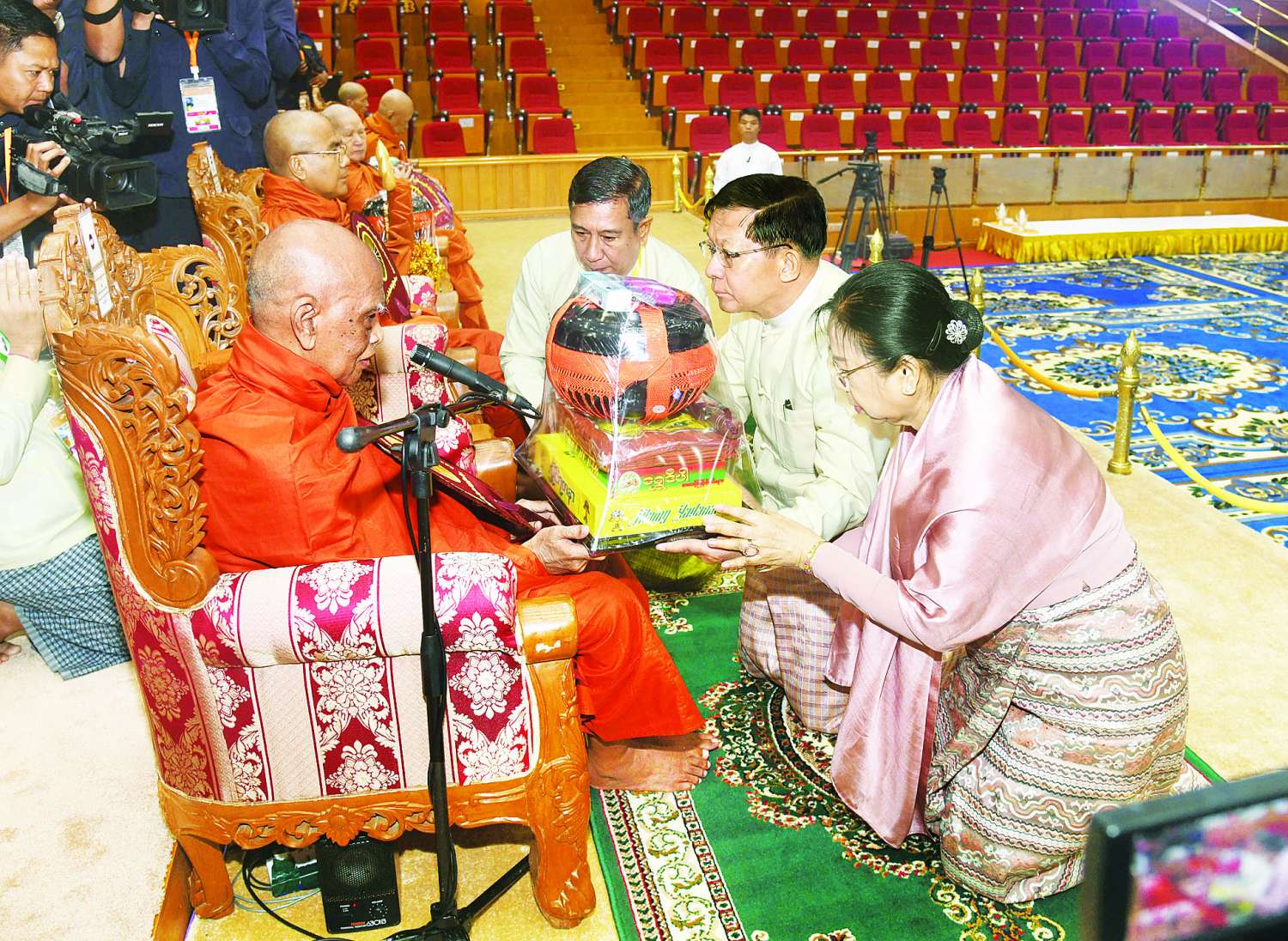 ဦးစွာ နိုင်ငံတော်ယာယီသမ္မတ နိုင်ငံတော်လုံခြုံရေးနှင့်အေးချမ်းသာယာရေးကော်မရှင်ဥက္ကဋ္ဌသည် အဂ္ဂါဓိပတိသာသနာ့ဗိမာန်တော်ကြီးအတွင်းရှိ မာရဝိဇယ နောင်တော်ကြီး ဗုဒ္ဓရုပ်ပွားတော်မြတ်အား ဖူးမြော်ကြည်ညို၍ မြသပိတ်ဆွမ်းတော်၊ ပန်း၊ ရေချမ်း၊ ဆီမီးနှင့် သစ်သီးတို့ကို ဆက်ကပ်လှူဒါန်းသည်။