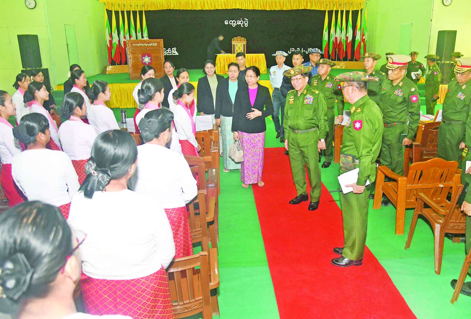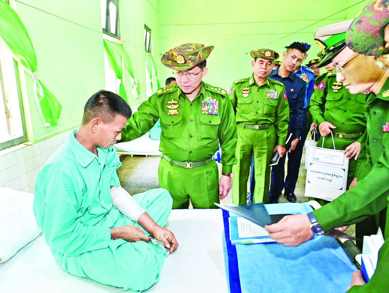 ယင်းနောက် နိုင်ငံတော်လုံခြုံရေးနှင့် အေးချမ်းသာယာရေးကော်မရှင် ဥက္ကဋ္ဌ တပ်မတော်ကာကွယ်ရေးဦးစီးချုပ်သည် တပ်နယ်ရှိ နယ်မြေခံတပ်မတော်ဆေးရုံတွင် တက်ရောက်ဆေးကုသမှုခံယူလျက်ရှိသည့် နိုင်ငံတော်ကာကွယ်ရေးနှင့် လုံခြုံရေးတာဝန်များ ထမ်းဆောင်စဉ် ထိခိုက်ဒဏ်ရာရရှိခဲ့သော အရာရှိ၊ စစ်သည်များ၊ ပြည်သူ့စစ်မှုထမ်းများအား ထိခိုက်ဒဏ်ရာရရှိခဲ့မှု အခြေအနေများ၊ ရောဂါကုသပျောက်ကင်းမှု အခြေအနေများကို တစ်ဦးချင်းလိုက်လံတွေ့ဆုံ၍ ရင်းနှီးနွေးထွေးစွာမေးမြန်းပြီး အားပေးစကားပြောကြားကာ အရာရှိ၊စစ်သည်များ၏ တင်ပြချက်များအပေါ် လိုအပ်သည်များ ဖြည့်ဆည်းဆောင်ရွက်ပေးသည်။