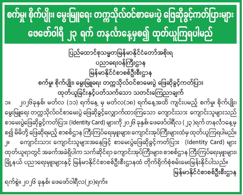 စက်မှု၊ စိုက်ပျိုး၊ မွေးမြူရေး တက္ကသိုလ်ဝင်စာမေးပွဲ ဖြေဆိုခွင့်ကတ်ပြား ထုတ်ယူခြင်းနှင့်ပတ်သက်သော သတင်းကြေညာချက်
