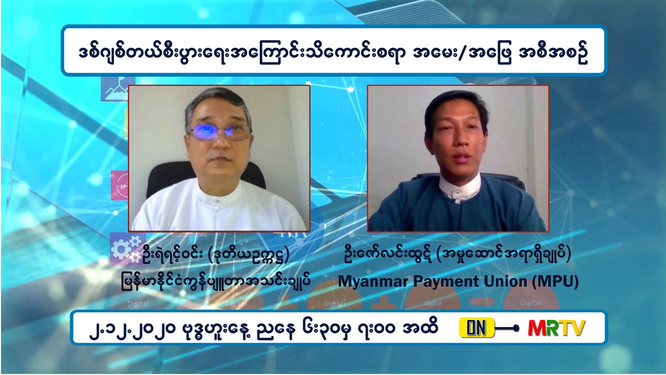 ဒီဇင်ဘာ ၂ ရက် ဗုဒ္ဓဟူးနေ့ ညနေတွင် မြန်မာနိုင်ငံ၏ Digital အသွင်ပြောင်းမှုမှာ အဓိက အရေးပါသည့် အခန်းကဏ္ဍမှာ ပါဝင်နေသည့် ဒစ်ဂျစ်တယ် ငွေပေးချေမှုစနစ် အသုံးပြုပြီး ဝန်ဆောင်မှုများ မြန်ဆန်လာအောင် ဆောင်ရွက်နိုင်ရန်အတွက် ဗဟုသုတ မျှဝေပေးမည့် ဒစ်ဂျစ်တယ် စီးပွားရေးအကြောင်း သိကောင်းစရာ အစီအစဉ်နှင့် စပ်လျဉ်း၍ မြန်မာနိုင်ငံ ကွန်ပျူတာအသင်းချုပ် ဒုတိယဥက္ကဋ္ဌ ဦးရဲရင့်ဝင်းနှင့် Myanmar Payment Union (MPU) အမှုဆောင်အရာရှိချုပ် ဦးဇော်လင်းထွဋ် တို့၏ ဆွေးနွေးချက်များကို ထုတ်လွှင့်သွားမည် ဖြစ်ကြောင်း သိရသည်။