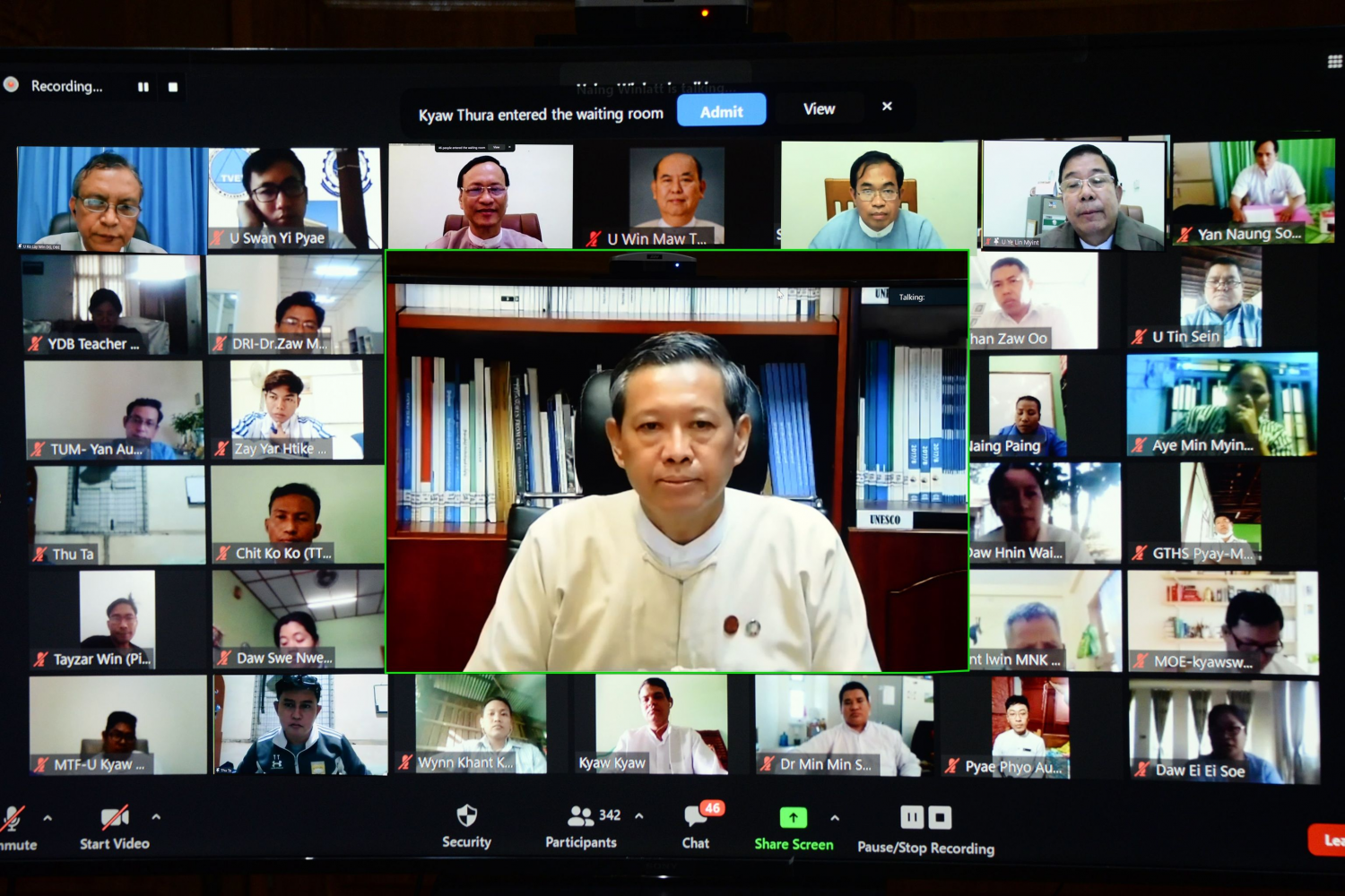 အစည်းအဝေးသို့ ပညာရေးဝန်ကြီးဌာန၊ ပြည်ထောင်စုဝန်ကြီး ဒေါက်တာ မျိုးသိမ်းကြီး၊ ဒုတိယဝန်ကြီး ဦးဝင်းမော်ထွန်း၊ ပညာရေးဝန်ကြီးဌာနမှ အမြဲတမ်းအတွင်း ဝန်နှင့် ညွှန်ကြားရေးမှူးချုပ်များ၊ ဒုတိယညွှန်ကြားရေးမှူးချုပ်များ၊ ဆရာသမဂ္ဂများ၊ ဆရာအသင်းအဖွဲ့များ၊ ဆရာဆရာမများနှင့် သက်ဆိုင်ရာတာဝန်ရှိသူများ အွန်လိုင်းဖြင့် ပါဝင်ဆွေးနွေးကြသည်။