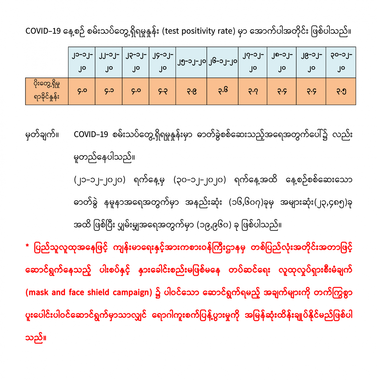 (၂၉-၁၂-၂၀၂၀) ရက်နေ့၊ ည (၈:၀၀) နာရီမှ (၃၀-၁၂-၂၀၂၀) ရက်နေ့၊ ည (၈:၀၀) နာရီ အတွင်း ဓာတ်ခွဲနမူနာ စုစုပေါင်း (၁၇,၀၁၀) ခုအား စစ်ဆေးပြီးစီးခဲ့ရာ COVID-19 ရောဂါ ဓာတ်ခွဲအတည်ပြု လူနာသစ် (၅၈၇) ဦး တွေ့ရှိရပါသည်။