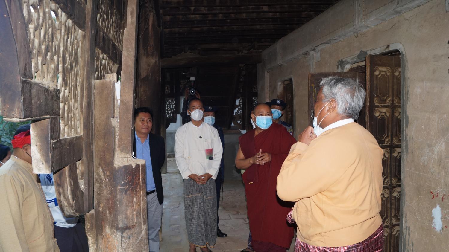 တိုင်းဒေသကြီးဝန်ကြီးချုပ်နှင့်အတူ မုံရွာမြို့နယ်တိုင်းဒေသကြီး လွတ်တော်ကိုယ်စားလှယ် ဒေါ်အမာကြည်၊ တိုင်းဒေသကြီး သာသနာရေးမှူး ဦးမျိုးဝင်းအောင်၊ မုံရွာခရိုင်အုပ်ချုပ်ရေးမှူး ဦးအောင်မြင့်စိုးတို့ လိုက်ပါလာခဲ့ရာ ချောင်းဦးမြို့နယ် စီမံခန့်ခွဲမှု ကော်မတီဥက္ကဋ္ဌ ဦးအောင်ဘော်နှင့်မြို့နယ်အဆင့်ဌာနဆိုင်ရာ တာဝန်ရှိသူများမှကြိုဆိုခဲ့ကြသည်။ ဝန်ကြီးချုပ်နှင့်အဖွဲ့သည် နှစ်တစ်ရာကျော် သက်တန်းရှိသည့် ရှေးဟောင်း ကျောင်းဆောင်၏ သစ်သားပေါ်ထွင်းထုထားသည့် ကနုတ်ပန်းဗိသုကာ လက်ရာများ၊ ကျောင်းဆောင်အတွင်းရှိ ရှေးဟောင်းပစ္စည်းများအား ကြည့်ရှုခဲ့ပြီး ရှေးဟောင်းယဥ်ကျေးမှုအနုပညာလက်ရာများ မပျက်စီးရအောင် ထိန်းသိမ်းစောင့်ရှောက်နိုင်ရေး ဆောင်ရွက်သွားမည်ဖြစ်ကြောင်း ပြောကြားခဲ့သည်။