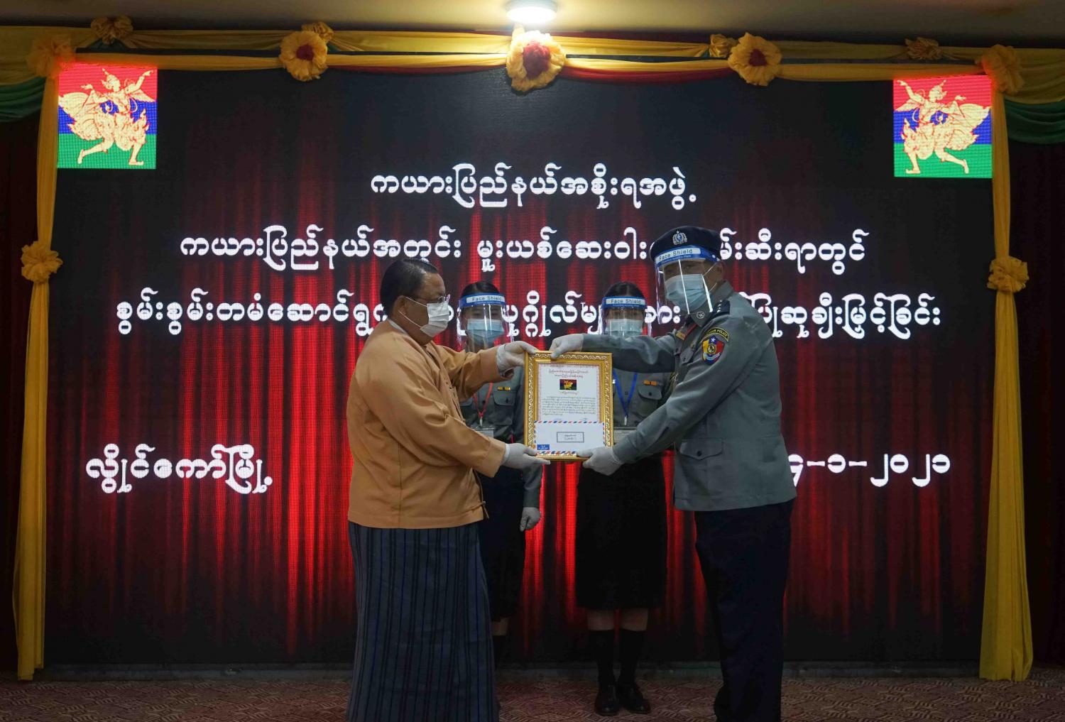 ကယားပြည်နယ်အတွင်း မူးယစ်ဆေးဝါးဖမ်းဆီးရာတွင် စွမ်းစွမ်းတမံဆောင်ရွက်ခဲ့သည့် ပုဂ္ဂိုလ်များအား ဂုဏ်ပြုဆုချီးမြှင့်ခြင်းကို ယမန်နေ့ မွန်းလွဲပိုင်းက ကယားပြည်နယ်အစိုးရအဖွဲ့ရုံး အစည်းအဝေးခန်းမ၌ ကျင်းပပြုလုပ်ခဲ့သည်။
