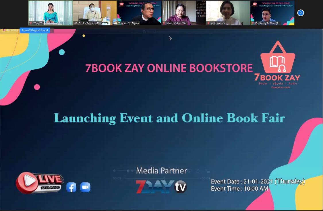 စာပေထုတ်ဝေဖြန့်ချိရေးကဏ္ဍအား ဒီဂျစ်တယ်စီးပွားရေး လုပ်ငန်းသစ်တစ်ခုအဖြစ် ပိုမိုတိုးတက်အောင်မြင်စေရေးနှင့် ပံ့ပိုးကူညီပေးနိုင်ရေး အတွက် 7 Book Zay Online Bookstore (7BookZay.com) မိတ်ဆက်ပွဲ အခမ်းအနားကို ယနေ့နံနက်(၁၀)နာရီက Virtual စနစ်ဖြင့် ကျင်းပရာ ပြန်ကြားရေးဝန်ကြီးဌာန၊ ပြည်ထောင်စုဝန်ကြီး ဒေါက်တာဖေမြင့် တက်ရောက်ခဲ့သည်။
