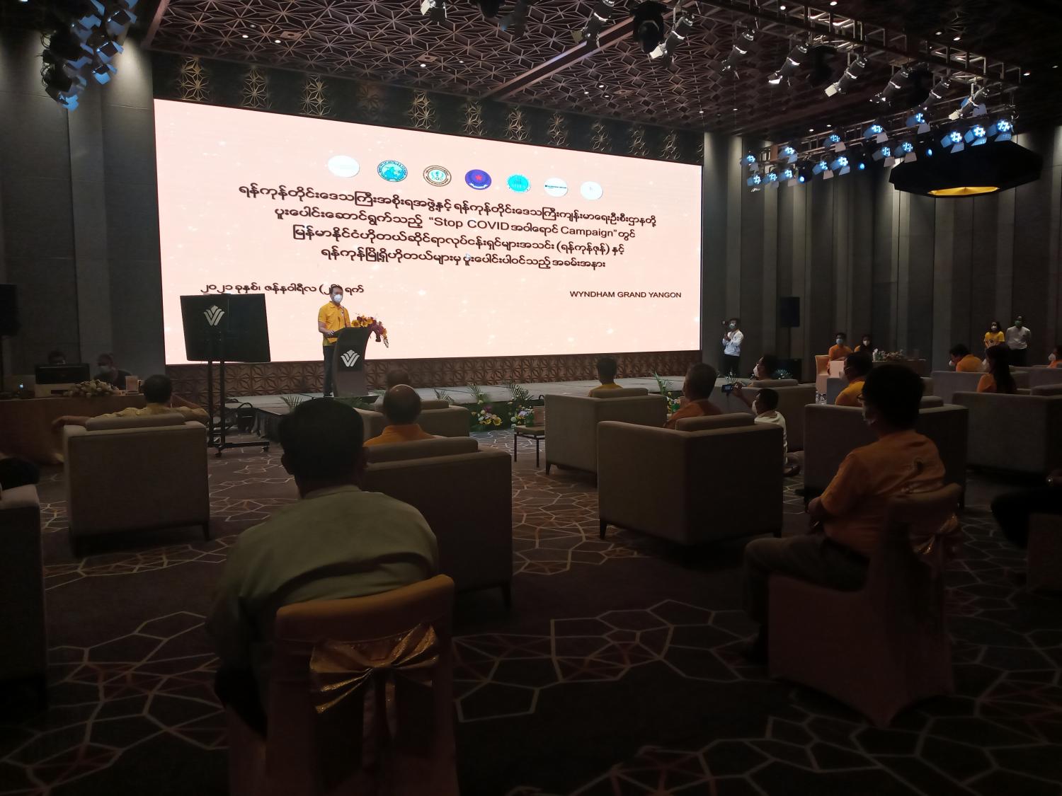 ရန်ကုန်တိုင်းဒေသကြီးအစိုးရအဖွဲ့နှင့် ရန်ကုန်တိုင်းဒေသကြီး ကျန်းမာရေးဦးစီးဌာနတို့ ပူးပေါင်း ဆောင်ရွက်သည့် “Stop COVID အဝါရောင် Campaign” တွင် မြန်မာနိုင်ငံ ဟိုတယ်ဆိုင်ရာ လုပ်ငန်း ရှင်များအသင်း(ရန်ကုန်ဇုန်)နှင့် ရန်ကုန်မြို့ရှိ ဟိုတယ်များမှ ပူးပေါင်းပါဝင်သည့် အခမ်းအနားကျင်းပ