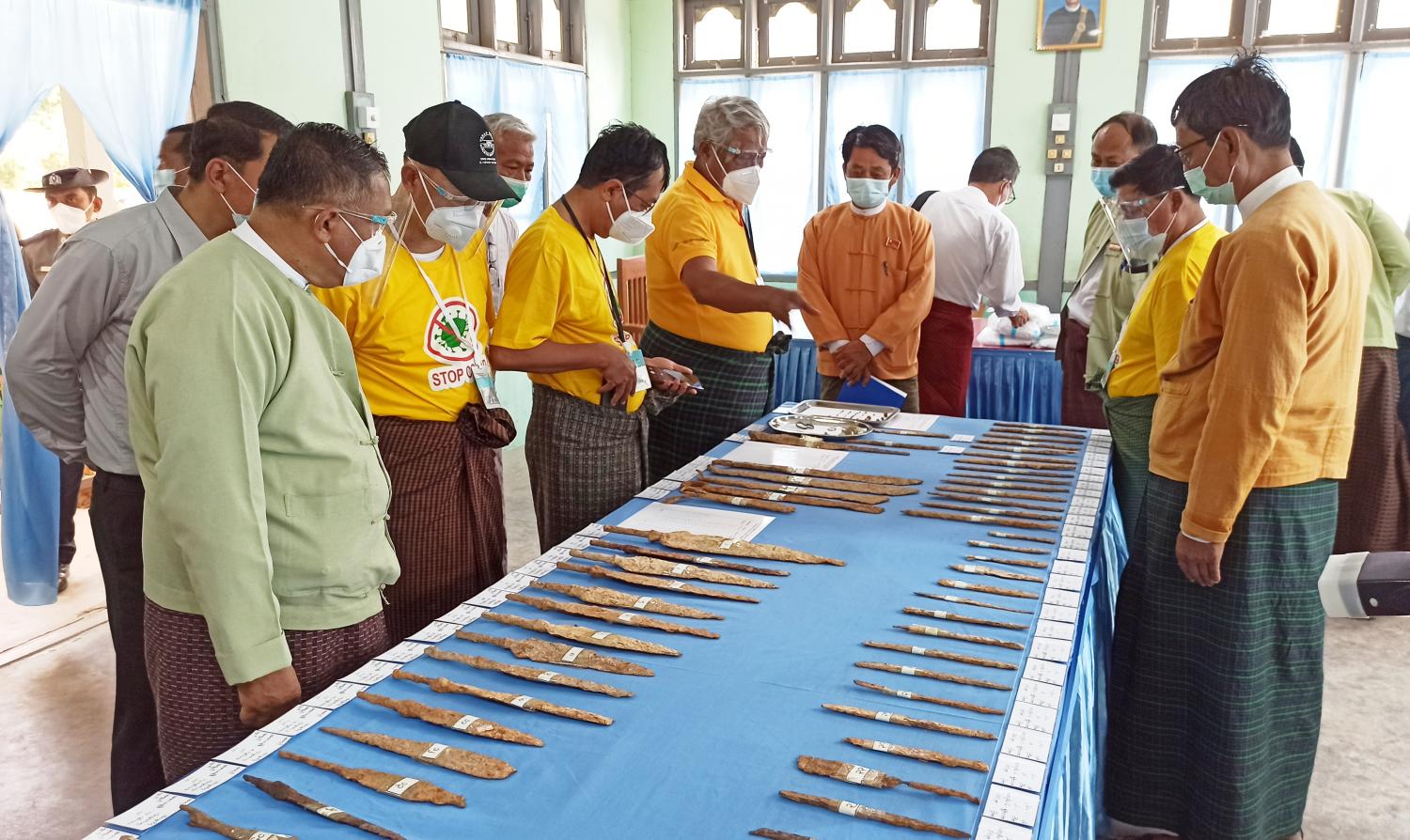 ထိုသို့ စစ်ဆေးရာတွင် စစ်ကိုင်းတိုင်းဒေသကြီး ဝန်ကြီးချုပ်ဒေါက်တာမြင့်နိုင်ကခါချဉ်ကုန်းမှတွေ့ရှိ ရသည့် ပုတီးစေ့ဆိုက်စုံ(၄၃)စေ့၊ အသုံးဆောင်ပစ္စည်း(၁၂)ခု၊ အမဲစွပ်လှံ(၁)ခု၊ ဓါး(၆၂)ချောင်း ၊သံချောင်း (၁၂)ချောင်း၊ တူရွင်း(၁၀)ချောင်း၊ ရဲဒင်း(၂)ချောင်း၊ သံလျှက်လှံပုံသွား(၂၆)ချောင်း၊ လက်ကိုင်ကွင်းပါဓါး (၄)ချောင်း၊ ကတ်ကြေး တစ်ချောင်းတို့ကို ကြည့်ရှုပြီး စနစ်တကျ အပ်နှံသွားရန်နှင့် လိုအပ်သည်များ လမ်းညွှန်မှာကြားခဲ့ကြောင်း သိရသည်။
