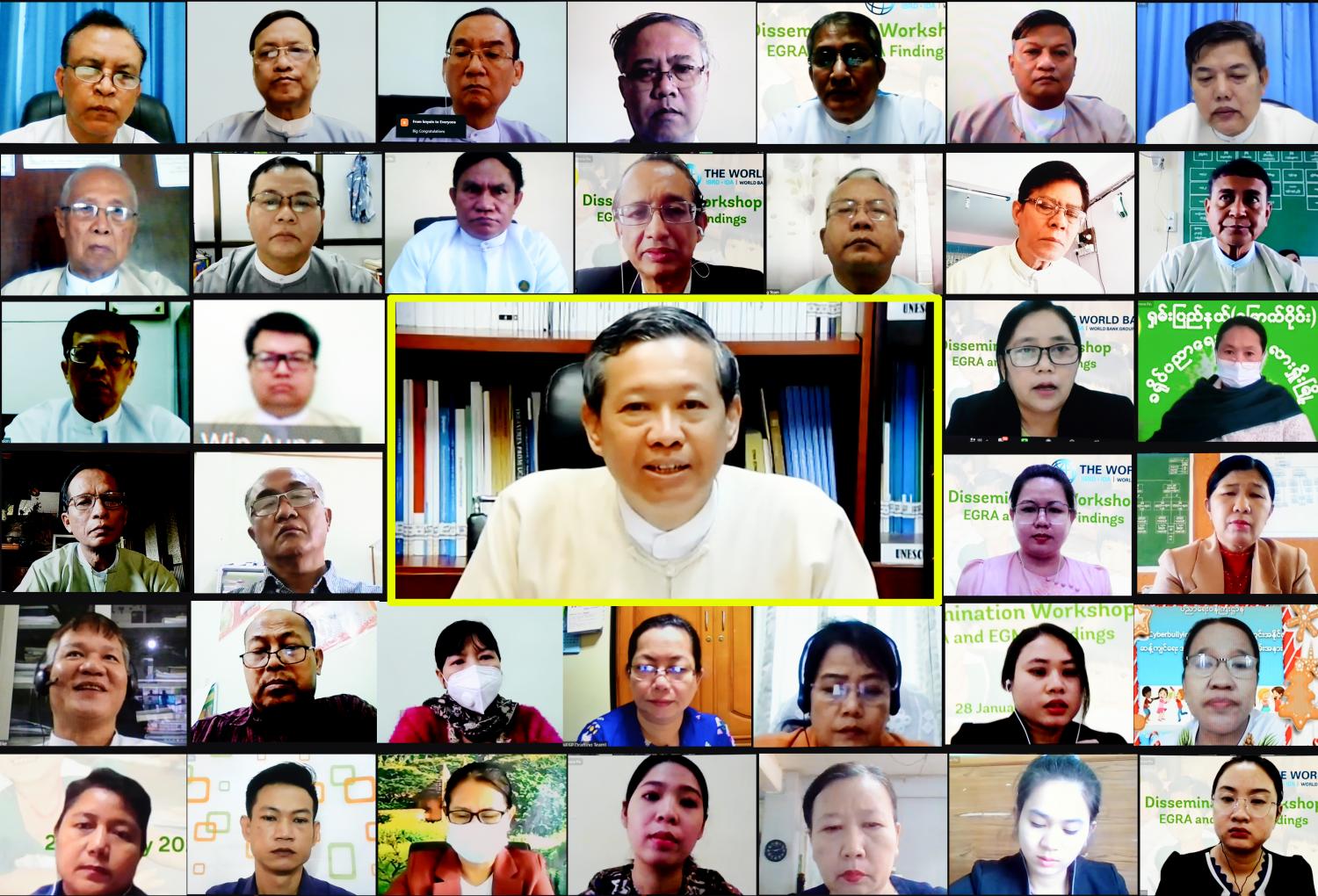 မူလတန်းအောက်ဆင့် သင်္ချာစွမ်းရည်နှင့် စာဖတ်စွမ်းရည်စစ်ဆေးအကဲဖြတ်ခြင်း (Early Grade Mathematics Assessment and Reading Assessment – EGRA/EGMA) သုတေသန လုပ်ငန်း၏ တွေ့ရှိချက်များနှင့် ဆက်လက်ဆောင်ရွက်မည့် လုပ်ငန်းစဉ်များ တင်ပြခြင်းလုပ်ငန်း ဆွေးနွေးပွဲအခမ်းအနားကို ယနေ့နံနက် ၉ နာရီတွင် ဗီဒီယိုကွန်ဖရင့် စနစ်ဖြင့် ကျင်းပသည်။