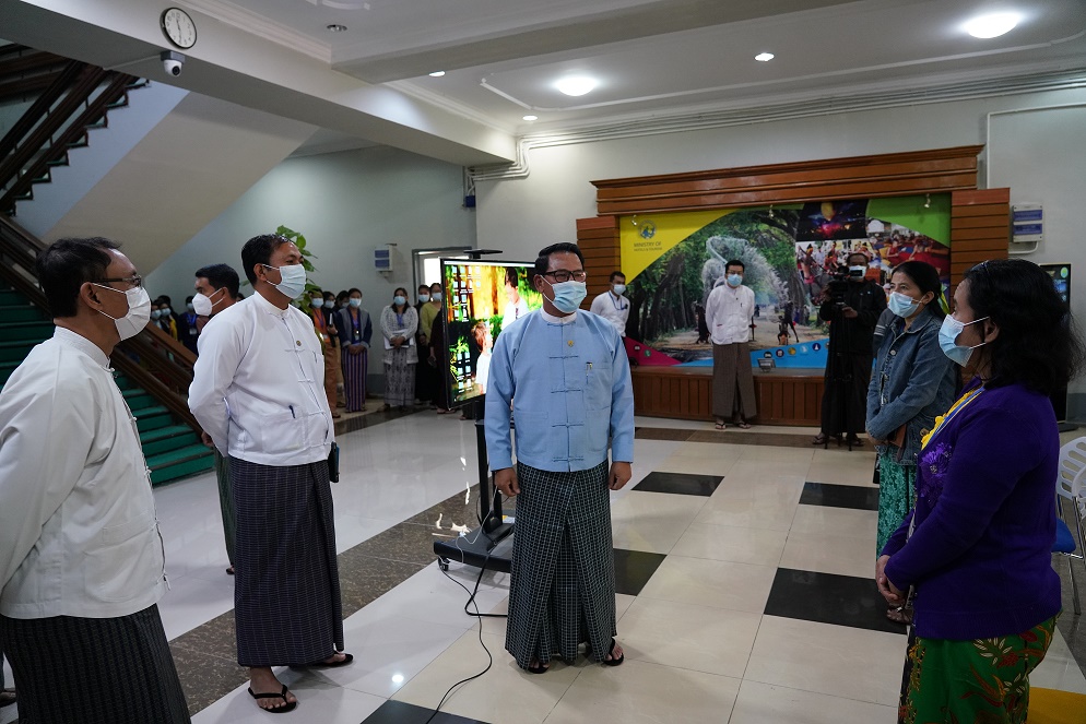 ထို့ပြင် ပြည်ထောင်စုဝန်ကြီးသည် ဝန်ကြီးဌာနရှိ အရာထမ်း၊ အမှုထမ်းများနှင့် ကျန်းမာရေးနှင့် အားကစား ဝန်ကြီးဌာနမှ ထုတ်ပြန်ထားသည့် ကိုဗစ်-၁၉ ကာကွယ်ရေးဆိုင်ရာ ညွှန်ကြားချက်များနှင့်အညီ Social Distancing စနစ်ဖြင့်လည်းကောင်း၊ ဗီဒီယိုကွန်ဖရင့်စနစ် ဖြင့်လည်းကောင်း တွေ့ဆုံ၍ ဝန်ထမ်းများအနေဖြင့် ဝန်ကြီးဌာန၏ လက်ရှိလုပ်ဆောင်နေ သောလုပ်ငန်းများကို အရှိန်အဟုန်မပျက် ဆက်လက်ဆောင်ရွက်ပြီး ရှေ့ဆက်လက်လုပ် ဆောင်ရမည့် လုပ်ငန်းများတွင်လည်း တာဝန်ကျေပွန်စွာ ပူးပေါင်း ပါဝင်ဆောင်ရွက်ပေးစေ လိုပါကြောင်း၊ ဝန်ထမ်းများ အနေဖြင့် လုပ်ငန်းတာဝန်များကို လစ်ဟင်းမှု မရှိစေရန် အထူး သတိပြု စေလိုပါကြောင်း၊ နိုင်ငံတော်အစိုးရအနေဖြင့်လည်း ဤဝန်ကြီး ဌာနကို ဂရုတစိုက် အထူးအလေး ထားပါကြောင်း၊ လုပ်ငန်းများ ဆောင်ရွက်ရာတွင်လည်း ဝန်ထမ်းများ အနေဖြင့် နိုင်ငံတော်အစိုးရနှင့် ဝန်ကြီးဌာန၏ မူဝါဒများနှင့်အညီ ဝန်ထမ်းစည်း မျဉ်းစည်းကမ်းများ လိုက်နာ၍ လုပ်ငန်းများ အောင်မြင်အောင် ဆောင်ရွက်သွားကြရန် လိုအပ်ပါကြောင်း၊ ဝန်ကြီး ဌာနက လက်ရှိချမှတ် ထားသော မူဝါဒများနှင့် လုပ်ငန်းများကို ယခုကာလ မူဝါဒများနှင့်အညီ ကိုက်ညီပါက ပိုမိုကောင်းမွန်အောင် ဆက်လက်အကောင် အထည်ဖော်သွားမည်ဖြစ်ပါ ကြောင်း၊ ဟိုတယ်နှင့် ခရီးသွားလုပ်ငန်းများ ဖွံ့ဖြိုးတိုးတက်ရေးအတွက် ဝန်ထမ်းများအားလုံး အားသွန်ခွန်စိုက် ညီညီညွတ်ညွတ်ဖြင့် ကြိုးပမ်းဆောင်ရွက်ကြရန် မှာကြားကြောင်း သိရ သည်။