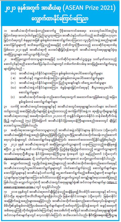 ၂၀၂၁ ခုနှစ်အတွက် အာဆီယံဆု (ASEAN Prize 2021) လျှောက်ထားနိုင်ကြောင်း ကြေညာ
