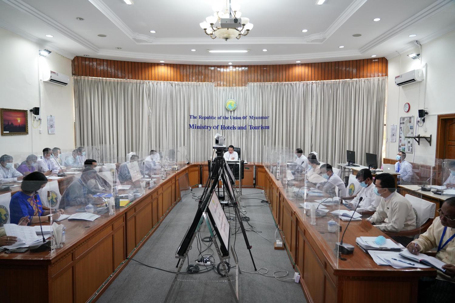 ဝန်ကြီးဌာနအနေဖြင့် ဟိုတယ်များ အမြန်ပြန်လည်ဖွင့်လှစ်ပြီး ခရီးသွား လုပ်ငန်းများ ပြန်လည်စတင်နိုင်ရန် ညွှန်ကြားချက်များ ရရှိပြီးဖြစ်ပါကြောင်း၊ ဟိုတယ်များ ကိုဗစ်-၁၉ စည်းမျဉ်းစည်းကမ်းနှင့်အညီ ပြန်လည်ဖွင့်လှစ်ရာတွင် ကျန်းမာရေးနှင့်အားကစားဝန်ကြီး ဌာနမှ စည်းမျဉ်းစည်းကမ်းများနှင့်အညီ ဆောင်ရွက်ရန်နှင့် ဝန်ကြီးဌာနမှ ရေးဆွဲထားသည့် Enchanting Myanmar Health & Safety Protocols နှင့်အညီ စစ်ဆေးပြီး အဆင့်သတ်မှတ် ပေးသွားမည်ဖြစ်ပါကြောင်း၊ ဝန်ကြီးဌာနအနေဖြင့် ပြည်တွင်းခရီးသွား လုပ်ငန်းများ ပြန်လည် စတင်နိုင်ရန် ထဲထဲဝင်ဝင်နှင့် ဦးဆောင်ဆောင်ရွက်ရန် လိုအပ်ပါကြောင်း၊ ဟိုတယ်များ ပြန်လည်ဖွင့်လှစ်သည့်အချိန်တွင် တာဝန်ထမ်းဆောင်နေသည့် ဝန်ထမ်းများကို ကိုဗစ်-၁၉ ကာကွယ်နိုင်ရေးအတွက် ကာကွယ် ဆေးထိုးနှံပေးနိုင်ရေး သက်ဆိုင်ရာ ဆက်စပ်ဝန်ကြီးဌာန များဖြင့် ပူးပေါင်းဆောင်ရွက်လျက်ရှိပါကြောင်း၊ ဌာနတာဝန်ခံများအနေဖြင့် လုပ်ငန်းများ ဆောင်ရွက်ရာတွင် မိမိကိုယ်တိုင်အရာရာကို ချင့်ချိန်တွေးတောကြံဆပြီး လုပ်ငန်းတာဝန်များ အား ကျေပွန်စွာထမ်းဆောင်ကြရန်လိုအပ်သလို မိမိတို့ကြီးကြပ်ကွပ် ကဲမှုပြုသော ဝန်ထမ်း များကိုလည်း ပါတီနိုင်ငံရေးကင်းရှင်းပြီး ဝန်ထမ်း စည်းမျဉ်းစည်းကမ်း များနှင့်အညီ လုပ်ငန်း တာဝန်များကို အလေးထား လိုက်နာစေရေး ကြပ်မတ် ဆောင်ရွက်ရန်လိုအပ်ပါကြောင်း၊ ဝန်ကြီးဌာနမှ ချမှတ်ထားသည့် မူဝါဒလုပ်ထုံးလုပ်နည်းများနှင့် အညီ ခရီးသွားလုပ်ငန်းဖွံ့ဖြိုး တိုးတက်ရေး အရှိန်အဟုန်မြှင့် ဆက်လက်ဆောင်ရွက်ရာတွင် ဝန်ထမ်းအားလုံး ပူးပေါင်းပါဝင် လုပ်ကိုင်သွားကြရန် လိုအပ်ပါကြောင်း ပြောကြားသည်။