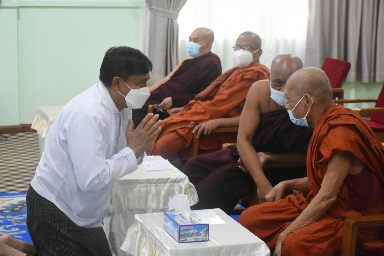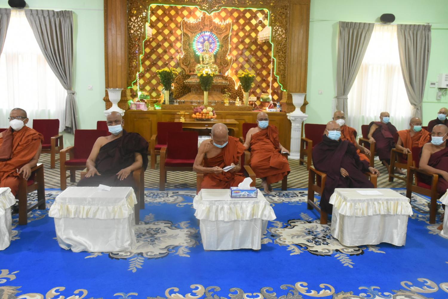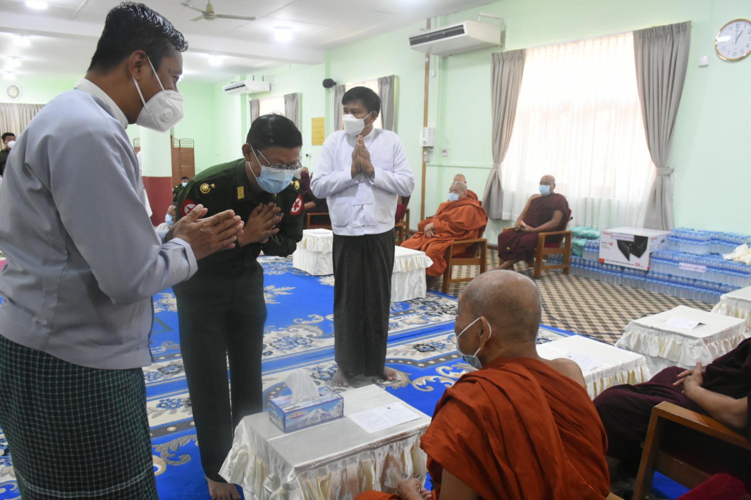 ရန်ကုန် မတ် ၁၉ နိုင်ငံတော်သံဃမဟာနာယကအဖွဲ့ဥက္ကဋ္ဌ ဗန်းမော်ကျောင်းတိုက်ဆရာတော်နှင့် ထေရ်ကြီး ဝါကြီးဆရာတော်ကြီးများအား COVID-19 ရောဂါကာကွယ်ဆေး ဒုတိယအကြိမ် ထိုးနှံပေးခြင်း အစီအစဉ်ကို ယနေ့နံနက်ပိုင်း၌ ရန်ကုန်တိုင်းဒေသကြီး မရမ်းကုန်းမြို့နယ် သိရီမင်္ဂလာ ကမ္ဘာ့အေးကုန်းမြေရှိ နိုင်ငံတော်သံဃမဟာနာယက အဖွဲ့ ဘုရားခန်း၌ ပြုလုပ်သည်။ ဆေးထိုးနှံခြင်း အစီစဉ်တွင် နိုင်ငံတော်သံဃမဟာနာယကအဖွဲ့ဥက္ကဋ္ဌ ဗန်းမော်ကျောင်း တိုက် ဦးစီးပဓာန နာယက ဆရာတော် ဘဒ္ဒန္တဒေါက်တာ ကုမာရာဘိဝံသ၊ နိုင်ငံတော် သြဝါဒါစရိယ၊ အင်းစိန်ရွာမကျောင်းတိုက်ဆရာတော် အဂ္ဂမဟာပဏ္ဍိတဘဒ္ဒန္တတိလော ကာဘိဝံသ နှင့်နိုင်ငံတော် သြဝါဒါစရိယဆရာတော်ကြီးများ၊ နိုင်ငံတော်သံဃမဟာနာယက အဖွဲ့အကျိုးတော် ဆောင် သန်လျင်မင်းကျောင်းဆရာတော် ဘဒ္ဒန္တစန္ဒိမာဘိဝံသနှင့်ရန်ကုန် တိုင်းဒေသကြီး ဂိုဏ်ပေါင်းစုံ သံဃနာယကဆရာတော်ကြီးများစုစုပေါင်း(၄၅)ပါးတို့အား ရန်ကုန်တိုင်းစစ်ဌာန ချုပ် ဆေးအဖွဲ့က ကျန်းမာရေးစစ်ဆေးပေးကြပြီး ဒုတိယအကြိမ်အဖြစ် COVID-19 ရောဂါ ကာကွယ် ဆေးထိုးနှံပေးကြသည်။ ထိုသို့ဆရာတော်ကြီးများအား COVID-19 ရောဂါကာကွယ်ဆေးထိုးနှံပေးနေမှုများကို ရန်ကုန်တိုင်းစစ်ဌာနချုပ် တိုင်းမှူးဗိုလ်ချုပ်ညွန့်ဝင်းဆွေ ၊ တိုင်းဒေသကြီးစီမံအုပ်ချုပ်ရေး ကောင်စီဝင် ဦးဇော်ဝင်း နှင့်တာဝန်ရှိ သူများက သွားရောက်ဖူးမြော်ကြည်ညိုခဲ့ကြ ကြောင်းသိရ သည်။ (သတင်းစဉ်)
