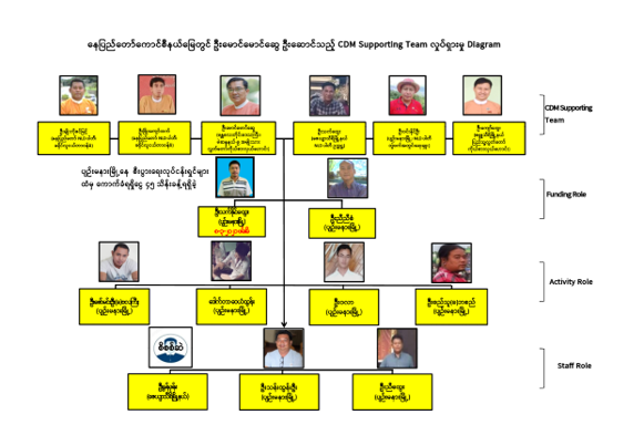 မတ် - ၁၉ နေပြည်တော်ကောင်စီနယ်မြေအတွင်းရှိ နိုင်ငံ့ဝန်ထမ်းများအား CDM တွင် ပါဝင်လာစေရေး ပျဉ်းမနားမြို့နေ ဦးသက်နိုင်ထွေးမှ သွေးထိုးလှုံ့ဆော်နေကြောင်း သတင်းအရ ဖမ်းဆီးရမိရေးဆောင်ရွက်ခဲ့ရာ ၂၀၂၁ ခုနှစ်၊ မတ်လ ၉ ရက်နေ့ ၀၂၃၀ နာရီခန့်တွင် အမှတ် (၉၃၂)၊ ၁၇ လမ်း၊ ပေါင်းလောင်း ၂ ရပ်ကွက်၊ ပျဉ်းမနားမြို့ရှိ ၎င်း၏နေအိမ်တွင် ဖမ်းဆီးရမိခဲ့ပါသည်။ ဦးသက်နိုင်ထွေး၏ ဝန်ခံထွက်ဆိုချက်များအရ နေပြည်တော်ကောင်စီနယ်မြေ အတွင်း နိုင်ငံ့ဝန်ထမ်းများအား တာဝန်ဝတ္တရားပျက်ကွက်စေရန် သွေးထိုးလှုံ့ဆော်နိုင်ရေး ရည်ရွယ်၍ ဖွဲ့စည်းထားသော CDM Supporting Team ၏ ဦးဆောင်သူ မန္တလေး တိုင်းဒေသကြီး၊ မဲဆန္ဒနယ်အမှတ်-၉၊ အမျိုးသားလွှတ်တော်ကိုယ်စားလှယ်ဟောင်း ဦးမောင်မောင်ဆွေ၏ စေခိုင်းမှုကြောင့် ဦးသက်နိုင်ထွေးသည် နိုင်ငံ့ဝန်ထမ်းများ CDM လုပ်ဆောင်မှုများတွင် ပါဝင်လာစေရေး ငွေကြေးဖြင့် ဆွဲဆောင်စည်းရုံးနိုင်ရန်အတွက် ပျဉ်းမနားမြို့နေ ဦးညီညီစံ နှင့်ပူးပေါင်း၍ စီးပွားရေးလုပ်ငန်းရှင်များနှင့် ရင်းနှီးသူများထံ ချိတ်ဆက်၍ ငွေကြေးကောက်ခံမှုများပြုလုပ်ခဲ့ရာ စုစုပေါင်းငွေကျပ် ၄၅ သိန်းခန့်အား ကောက်ခံရရှိခဲ့ပြီး ဇေယျာသီရိမြို့နယ် NLD ပါတီဥက္ကဋ္ဌ ဦးသက်ထွေးထံသို့ အပ်နှံခဲ့ ကြောင်း သိရှိရပါသည်။ နေပြည်တော်ကောင်စီနယ်မြေအတွင်း၌ CDM Supporting Team အား မန္တလေးတိုင်းဒေသကြီး၊ မဲဆန္ဒနယ်အမှတ်-၉၊ အမျိုးသားလွှတ်တော်ကိုယ်စားလှယ်ဟောင်း ဦးမောင်မောင်ဆွေမှ ဦးဆောင်၍ ဇမ္ဗူသီရိမြို့နယ် ပြည်သူ့လွှတ်တော်ကိုယ်စားလှယ်ဟောင်း ဦးကျော်ထွေး၊ ဇေယျာသီရိမြို့နယ် NLD ပါတီဥက္ကဋ္ဌ ဦးသက်ထွေး၊ ပျဉ်းမနားမြို့၊ NLD ပါတီတွဲဖက်အတွင်းရေးမှူး ဦးဝင်းနိုင်ဦး၊ နေပြည်တော် NLD ပါတီ ခရိုင်လူငယ် တာဝန်ခံ ဦးဖြိုးကျော်ထက်နှင့် ဦးမျိုးကိုဇင်မြင့် တို့ဖြင့် ဖွဲ့စည်းထားကြောင်း သိရှိရ ပါသည်။ အထက်ပါ CDM Supporting Team ထံသို့ ဂျပန်နိုင်ငံရောက် မြန်မာများမှ ငွေကျပ်သိန်း ၃၀၀ ခန့်၊ ထိုင်းနိုင်ငံရောက် မြန်မာများမှငွေကျပ်သိန်း ၁၅၀ ခန့် လွှဲပြောင်း ပေးပို့ခဲ့သည်ဟုသိရှိရပြီး ၎င်းငွေများအား ဦးမောင်မောင်ဆွေ နှင့် ဦးဝင်းနိုင်ဦးတို့မှ ရန်ကုန်မြို့သို့ သွားရောက်ယူဆောင်ခဲ့ကြောင်း၊ ပြည်တွင်း/ပြည်ပမှ စုစုပေါင်းကောက်ခံ ရရှိငွေကျပ်သိန်း ၅၀၀ ခန့်ရရှိခဲ့ပြီး နေပြည်တော်ကောင်စီနယ်မြေအတွင်းရှိ ဝန်ထမ်း ၇၀၆ ဦးအား တစ်ဦးလျှင်ငွေကျပ် ၆၀,၀၀၀ နှုန်းဖြင့် ငွေကျပ် ၄၂၃ သိန်းခန့်ဖြန့်ဝေ ပေးခဲ့ပြီး နိုင်ငံ့ဝန်ထမ်းများအား တာဝန်ဝတ္တရားပျက်ကွက်စေရေး ဆောင်ရွက်ခဲ့ကြောင်း သိရှိရပါသည်။ ထို့အပြင် နိုင်ငံ့ဝန်ထမ်းများ CDM တွင် ပါဝင်လုပ်ဆောင်လာပြီး နေရပ်ပြန် နိုင်ရန်နှင့် ပုန်းရှောင်နိုင်ရန်အတွက် 
