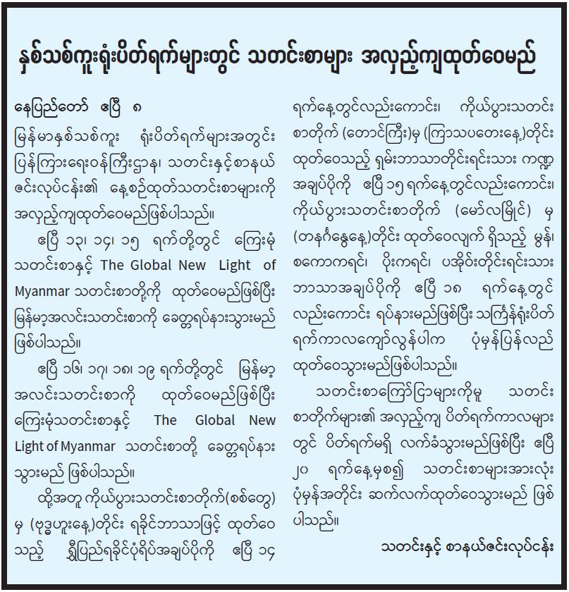 နှစ်သစ်ကူးရုံးပိတ်ရက်များတွင် သတင်းစာများ အလှည့်ကျထုတ်ဝေမည်
