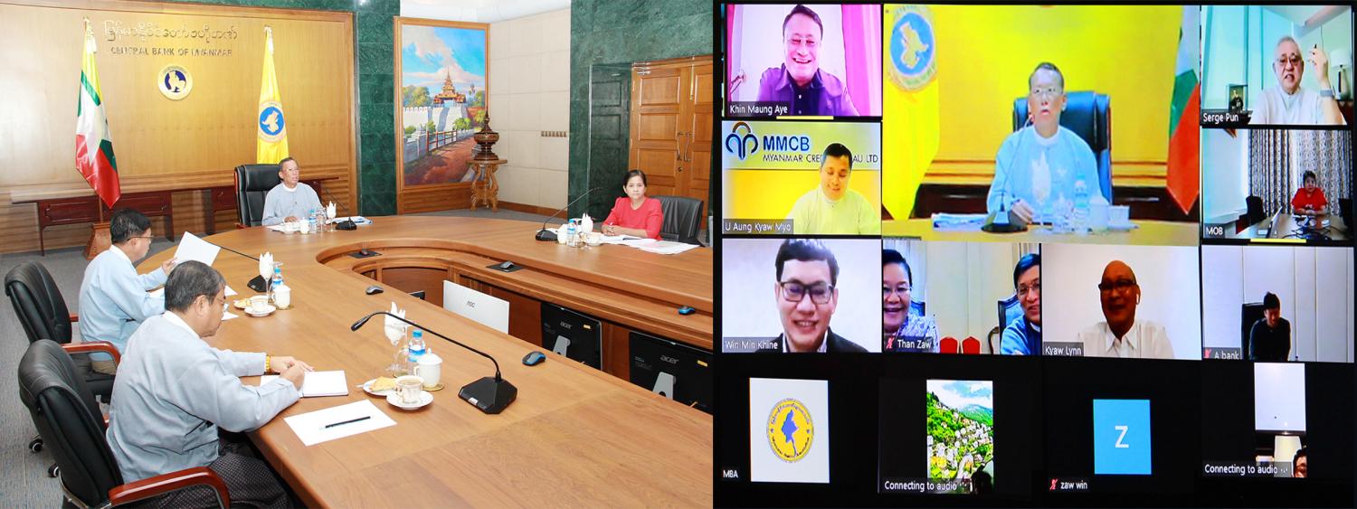 မြန်မာနိုင်ငံတော်ဗဟိုဘဏ် ဥက္ကဋ္ဌ ဦးသန်းညိန်းသည် မြန်မာနိုင်ငံဘဏ်များ အသင်း နာယက၊ ဥက္ကဋ္ဌနှင့် ပုဂ္ဂလိက ဘဏ်များမှ ဥက္ကဋ္ဌများ၊ ဒုတိယဥက္ကဋ္ဌများ၊ တာဝန်ရှိသူများကို ယနေ့ နံနက် ၁၀ နာရီခွဲတွင် ဗီဒီယိုကွန်ဖရင့်စနစ်ဖြင့် တွေ့ဆုံသည်။