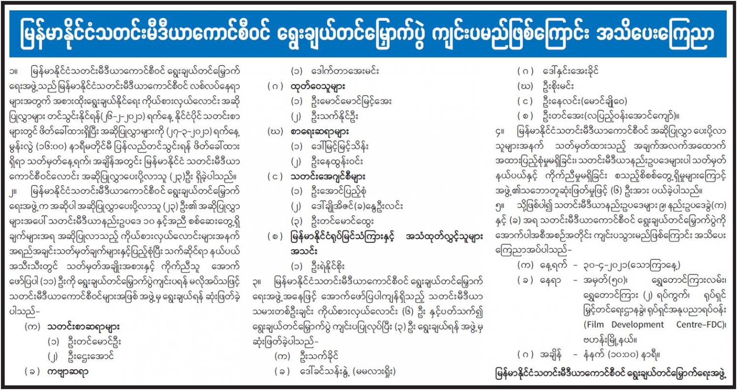 မြန်မာနိုင်ငံသတင်းမီဒီယာကောင်စီဝင် ရွေးချယ်တင်မြှောက်ပွဲ ကျင်းပမည်ဖြစ်ကြောင်း အသိပေးကြေညာ 04/12/2021 မြန်မာနိုင်ငံသတင်းမီဒီယာကောင်စီဝင် ရွေးချယ်တင်မြှောက်ပွဲ ကျင်းပမည်ဖြစ်ကြောင်း အသိပေးကြေညာ