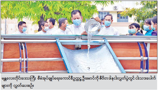 ယင်းနောက် ဆရာတော် သံဃာတော်များအား တိုင်းဒေသ ကြီး စီမံအုပ်ချုပ်ရေးကောင်စီ ဥက္ကဋ္ဌနှင့် အဖွဲ့ဝင်များကလှူဖွယ် ဝတ္ထုပစ္စည်းများနှင့် နဝကမ္မ အလှူငွေများ ဆက်ကပ်လှူဒါန်းကြပြီး စံပယ်ရုံ မိုးကုတ်ရိပ်သာ  ပဓာနနာယကထံမှ အနုမောဒနာရေစက်ချတရား နာယူကြည်ညို ကြကာလှူဒါန်းမှု အစုစုတို့ အတွက် ရေစက်သွန်းလောင်း အမျှပေးဝေ ကြသည်။