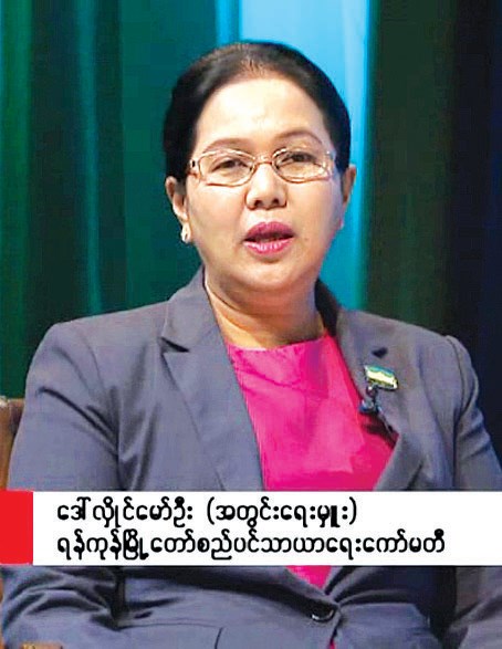 ဒေါ်လှိုင်မော်ဦး ။ ။ ကျွန်မ တစ်ခုလေး ထပ်ဖြည့် ပြောချင်ပါတယ်။ ကျွန်မတို့က ရိုးရှင်းဖို့၊ လွယ်ကူဖို့၊ မြန်ဆန်ဖို့၊ သက်သာဖို့ လိုသလို တစ်ဖက်မှာလည်း အရည်အသွေး အနေနဲ့ အာမခံချက်ရှိဖို့ လိုပါတယ်။ ဒါကြောင့် ကျွန်မတို့ တစ်ဖက်က ဖြေလျှော့ ပေးနေသလို တစ်ဖက်က ထိန်းချုပ်နိုင်မယ့် အာမခံချက်နဲ့ ပတ်သက်တဲ့ ဥပဒေတွေ၊ လုပ်ထုံးလုပ်နည်းတွေလည်း လိုမှာဖြစ်ပါ တယ်။ လွယ်ပြီး၊ မြန်ပြီး၊ သက်သာပြီး အာမခံချက်မရှိရင်လည်း ရေရှည်မှာကျတော့ ခုနပြောတဲ့ စီးပွားရေး ပတ်ဝန်းကျင်ကောင်း ဖြစ်မှာ မဟုတ်ပါဘူး။