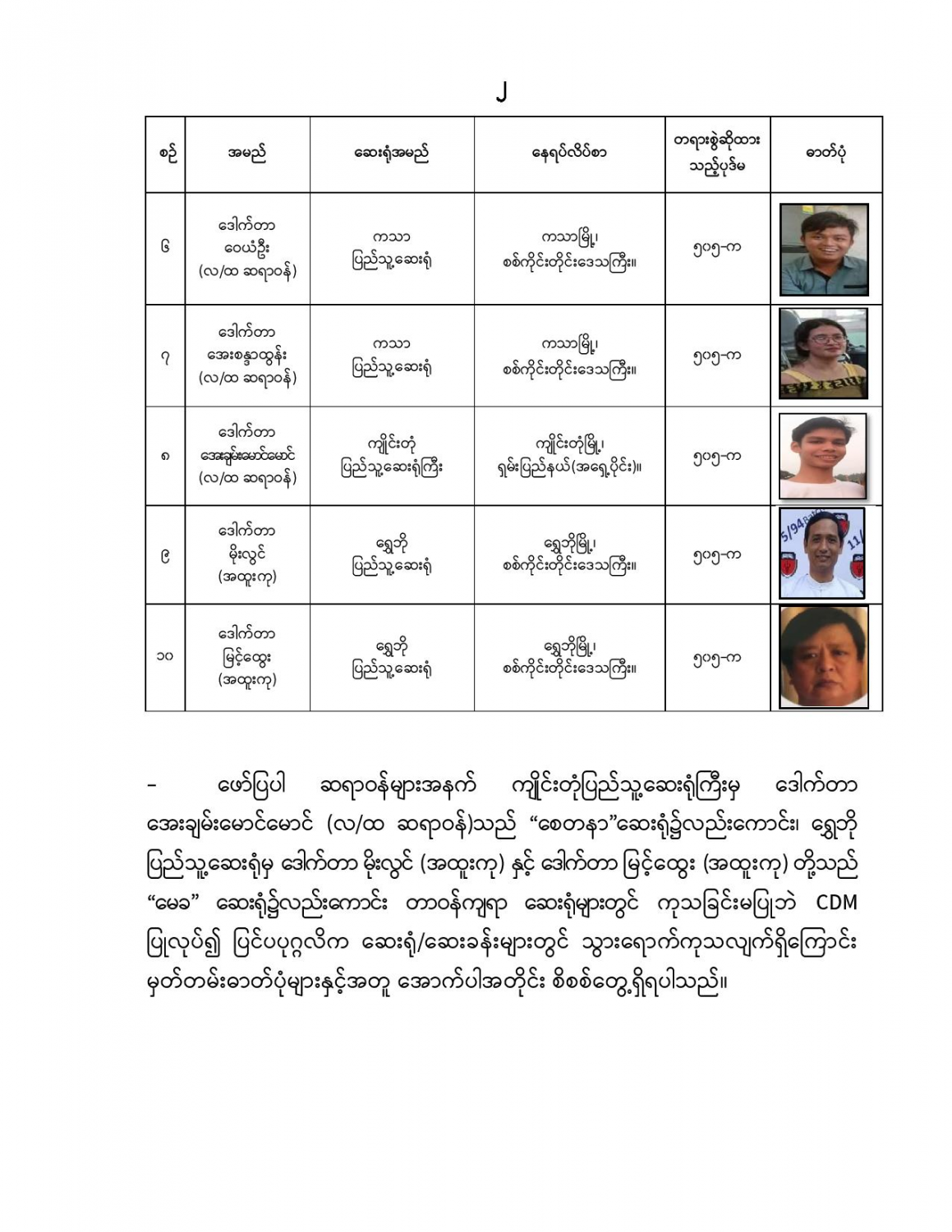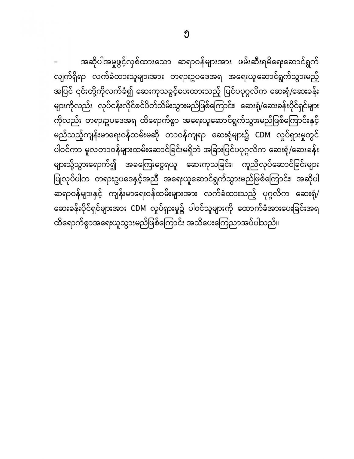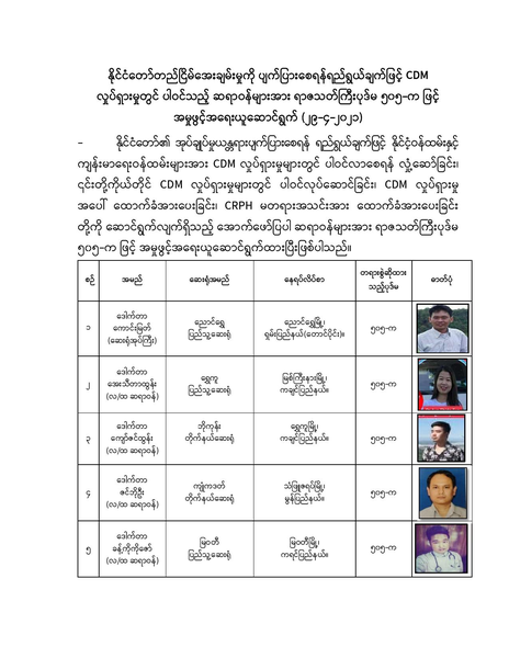 နိုင်ငံတော်တည်ငြိမ်အေးချမ်းမှုကို ပျက်ပြားစေရန်ရည်ရွယ်ချက်ဖြင့် CDM လှုပ်ရှားမှုတွင် ပါဝင်သည့် ဆရာဝန်များအား ရာဇသတ်ကြီးပုဒ်မ ၅၀၅-က ဖြင့် အမှုဖွင့်အရေးယူဆောင်ရွက် (၂၉-၄-၂၀၂၁)