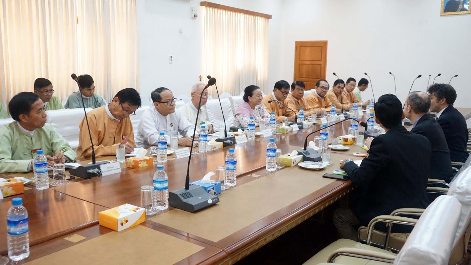ကရင်ပြည်နယ်အစိုးရအဖွဲ့၊ ပြည်နယ်ဝန်ကြီးချုပ်ဒေါ်နန်းခင်ထွေးမြင့်နှင့်အစိုးရအဖွဲ့ဝင်ဝန်ကြီးများသည် မြန်မာ နိုင်ငံဆိုင်ရာ ဗြိတိန်သံအမတ်ကြီး H.E Mr.Dan Chuggg နှင့်အဖွဲ့အား ယမန်နေ့ မွန်းလွဲ ၂ နာရီခွဲက ဘားအံမြို့၊ ပြည်ထောင်စုဧည့်ရိပ်သာ ပဒိုဒေးဗစ်တောခန်းမ၌ လက်ခံတွေ့ဆုံခဲ့သည်။