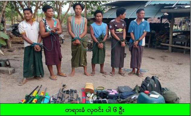ထိုသို့ဆောင်ရွက်ခဲ့ရာ မေလ ၃ ရက်နေ့ နံနက် ၉ နာရီခွဲအချိန်တွင် မန္တလေးတိုင်း ဒေသကြီး၊ ပြင်ဦးလွင်မြို့နယ်၊ ပြင်ဦးလွင်-လားရှိုးကားလမ်း မိုင်တိုင်အမှတ် ၄၇ မိုင်နှင့် ၄၈ မိုင်ကြား ရှိ စစ်ဆေးရေးဂိတ်၌ သီပေါမြို့ဘက်မှ မန္တလေးမြို့ဘက်သို့ မောင်းနှင်လာသော “ရီရှင်း” ခရီးသည်တင်မှန်လုံယာဉ်ပေါ်တွင် တင်ဆောင်လာသည့် အထုပ်အတွင်းမှ လေးကိုင်း ၄ ခုနှင့် မြှားတံ ၂၄၀ ချောင်းတို့အား လည်းကောင်း၊ မွန်းလွဲ ၂ နာရီအချိန်တွင် မကွေးတိုင်းဒေသကြီး၊ ထီးလင်း မြို့နယ်၊ ထီးလင်း-ဂန့်ဂေါကားလမ်း မိုင်တိုင်အမှတ် ၁၃၃ မိုင် ၆ ဖာလုံ နှင့် ၇ ဖာလုံကြား၌ နှောင်းဝင်း(ဘ)ဦးညိုလှ နှင့် နိုင်ဝင်း(ဘ)ဦးသာညွန့် တို့ ၂ ဦးအား တူမီးသေနတ် ၂ လက်နှင့် ဆက်စပ်ပစ္စည်းများဖြင့် လည်းကောင်း၊ တနင်္သာရီတိုင်းဒေသကြီး၊ မြိတ်မြို့နယ်၊ သဘွတ်ကျေးရွာ ရှိ ဦးမျိုးဝင်း(ဘ)ဦးစောတင် အား လက်လုပ်သေနတ် ၂ လက်၊ ဓားမျိုးစုံ ၃၇ ချောင်း၊ ဆက်စပ်ပစ္စည်း များနှင့်လည်းကောင်း၊ ည ၆ နာရီ ၂၀ မိနစ်အချိန်တွင် ရန်ကုန်တိုင်းဒေသကြီး၊ တောင်ဥက္ကလာပ မြို့နယ်၊ (၁၁)ရပ်ကွက်၊ အမှတ်(၂၂၈/ခ) မြေညီထပ်ရှိ SU & CO Luxury Boutique Café ဆိုင်အတွင်းမှ ဓာတ်ငွေ့ကာမျက်မှန် ၄၄ ခုအား လည်းကောင်း၊ ည ၁၁ နာရီ ၅၀ မိနစ်ခန့်တွင် နေပြည်တော်ကောင်စီနယ်မြေ၊ ပုပ္ဗသီရိမြို့နယ်၊ ဝဏ္ဏဒီပရပ်ကွက်၊ သရက်ရှင်းချောင်းဆည်အနီး ဦးခင်မောင်မြင့်(ဘ)ဦးအောင်ဇော်၊ ဦးညီတင်(ဘ)ဦးထွန်းတင် နှင့် ဦးကျော်သူ(ဘ)ဦးဘိုပြားတို့အား လက်လုပ်သေနတ် ၇ လက်၊ ဆက်စပ်ပစ္စည်းများနှင့်လည်းကောင်း၊ မန္တလေး တိုင်းဒေသကြီး၊ မဟာအောင်မြေမြို့နယ်၊ ၃၅ လမ်း၊ ၈၅ နှင့် ၈၆ လမ်းကြား မြတောင်ကျောင်း တိုက်အတွင်းရှိ ရတနာပုံရွှေကျောင်းအတွင်းမှ လက်လုပ်ဒိုင်း ၁၂၀ ချပ်၊ အခြားစာရွက်စာတမ်းများနှင့် ဆူပူအကြမ်း ဖက်ရာတွင် အသုံးပြုသည့် ပစ္စည်းများနှင့်လည်းကောင်း၊ ယနေ့နံနက် ၃ နာရီခွဲအချိန်တွင် ပဲခူးတိုင်း ဒေသကြီး၊ ရေတာရှည် မြို့နယ်၊ မြို့လှမြို့၊ ဂွေးသဲကျေးရွာ ကျွန်းစိုက်ခင်း အတွင်းရှိ အောင်တေဇ (၄၅)နှစ် (ဘ) ဦးသန်းထွန်း ၏ နေအိမ်မှ ၎င်းနှင့်အတူ အမျိုးသား ၆ ဦးတို့အား လက်လုပ်သေနတ် ၄ လက်၊ ဓားမျိုးစုံ ၅ ချောင်း၊ ပြောက်ကျားဝတ်စုံ ၂ စုံ၊ ငွေစက္ကူရောရာ ၈၄ သိန်းကျပ်နှင့် အခြားဆက်စပ်ပစ္စည်းများဖြင့်လည်းကောင်း၊ နံနက် ၈ နာရီခွဲအချိန်တွင် ရန်ကုန်တိုင်းဒေသကြီး၊ အင်းစိန်မြို့နယ်၊ (က+ခ) ရပ်ကွက်၊ ဘုရင့်နောင် လမ်းမကြီး(ခ-၄)လမ်းထိပ်ရှိ အမှိုက်ကန် အတွင်းမှ လက်လုပ်သေနတ် ၂ လက်၊ ဂက်စ်ဘူး ၂ ဘူး၊ ကော်ပိုက် ၂ ချောင်းတို့အား လည်းကောင်း၊ မကွေး တိုင်းဒေသကြီး၊ ထီးလင်းမြို့နယ်၊ ပဇဉ်းခေါင်းကျေးရွာလမ်းဘေးမှ တူမီးသေနတ် ၁ လက်၊ ဝက်သက်ကျေးရွာ မြောက်ဘက် ထီးလင်း-ဂန့်ဂေါသ