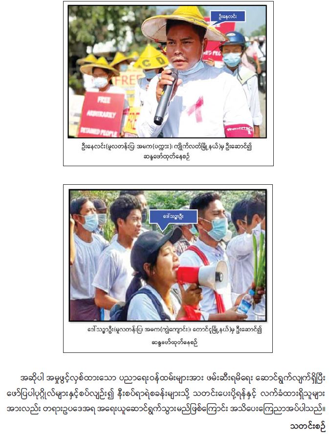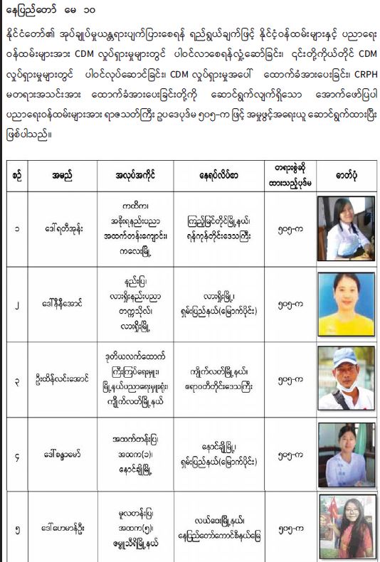 နိုင်ငံတော် တည်ငြိမ်အေးချမ်းမှုကို ပျက်ပြားစေရန်ရည်ရွယ်ချက်ဖြင့် CDM လှုပ်ရှားမှုတွင် ပါဝင်သည့် ပညာရေးဝန်ထမ်းများအား ရာဇသတ်ကြီးဥပဒေပုဒ်မ ၅၀၅-က ဖြင့် အမှုဖွင့် အရေးယူဆောင်ရွက်(၁၀-၅-၂၀၂၁) 05/11/2021