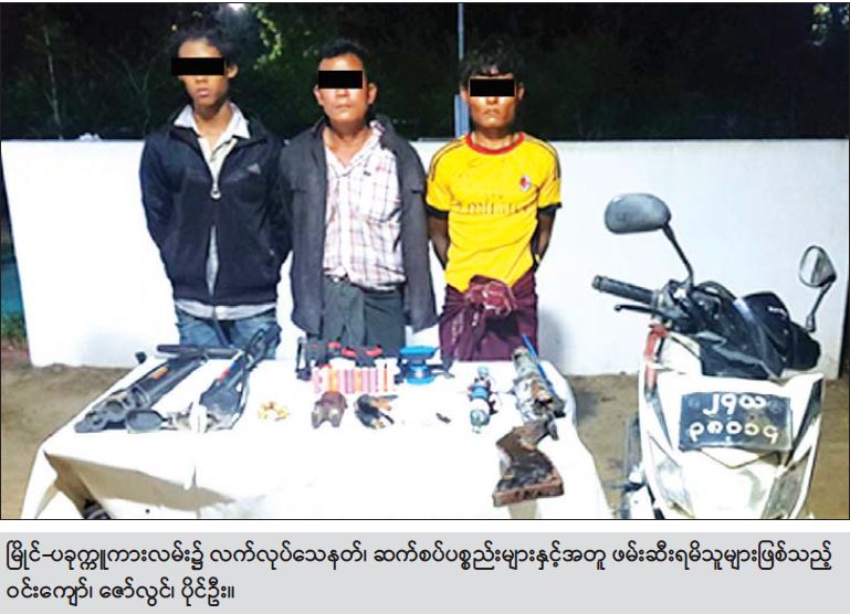 ထို့အတူ ည ၇ နာရီ မိနစ် ၅၀ တွင် မကွေးတိုင်းဒေသကြီး၊ မြိုင်မြို့ရှိ လုံခြုံရေး တပ်ဖွဲ့ဝင်များ သည် ရပ်ရွာအေးချမ်းသာယာရေးအတွက် မြို့ပေါ်ရပ်ကွက်များအတွင်း လှည့်ကင်းဆောင်ရွက် နေစဉ်အမှတ်(၃)ရပ်ကွက်၊ မြိုင်-ပခုက္ကူကားလမ်းပေါ်တွင် အဆိုပါ ရပ်ကွက်နေ ပိုင်ဦး(၃၀)နှစ် (ဘ)ဦးကောင်း ပါ အမျိုးသား ၃ ဦး စီးနင်းလာသော ဆိုင်ကယ်အား ရပ်တန့်စစ်ဆေးခဲ့ရာ ၎င်းတို့ ၃ ဦးထံမှ လက်လုပ် လေသေနတ် ၁ လက်နှင့် ဆက်စပ်ပစ္စည်းများအား တွေ့ရှိ သိမ်းဆည်းရမိခဲ့သည်။