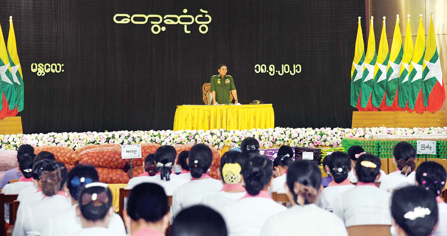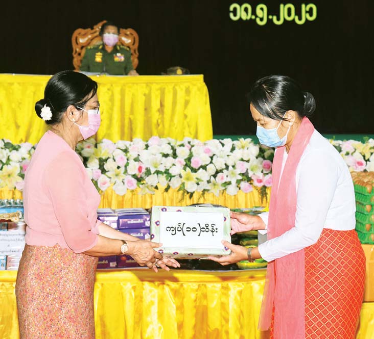 တွေ့ဆုံပွဲအပြီးတွင် နိုင်ငံတော်စီမံအုပ်ချုပ်ရေးကောင်စီဥက္ကဋ္ဌ၊ တပ်မတော် ကာကွယ်ရေး ဦးစီးချုပ်က စားသောက်ဖွယ်ရာပစ္စည်းများကို ပေးအပ်ရာ တိုင်းမှူးက လက်ခံရယူသည်။ ယင်းနောက် နိုင်ငံတော်စီမံအုပ်ချုပ်ရေးကောင်စီဥက္ကဋ္ဌ၊ တပ်မတော် ကာကွယ်ရေးဦးစီးချုပ်၏ ဇနီးက တပ်နယ် မိခင်နှင့် ကလေးအသင်းအတွက် ချီးမြှင့်ငွေ များကို ပေးအပ်ရာ တိုင်းမှူး၏ ဇနီးက လက်ခံရယူသည်။