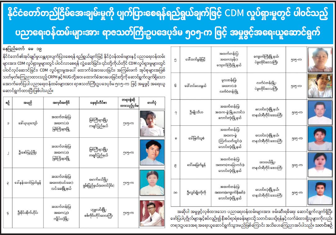 နိုင်ငံတော်တည်ငြိမ်အေးချမ်းမှုကို ပျက်ပြားစေရန် ရည်ရွယ်ချက်ဖြင့် CDM လှုပ်ရှားမှုတွင် ပါဝင်သည့် ပညာရေးဝန်ထမ်းများအား ရာဇသတ်ကြီးဥပဒေပုဒ်မ ၅၀၅-က ဖြင့် အမှုဖွင့်အရေး ယူဆောင်ရွက်(၁၉-၅-၂၀၂၁) 05/20/2021