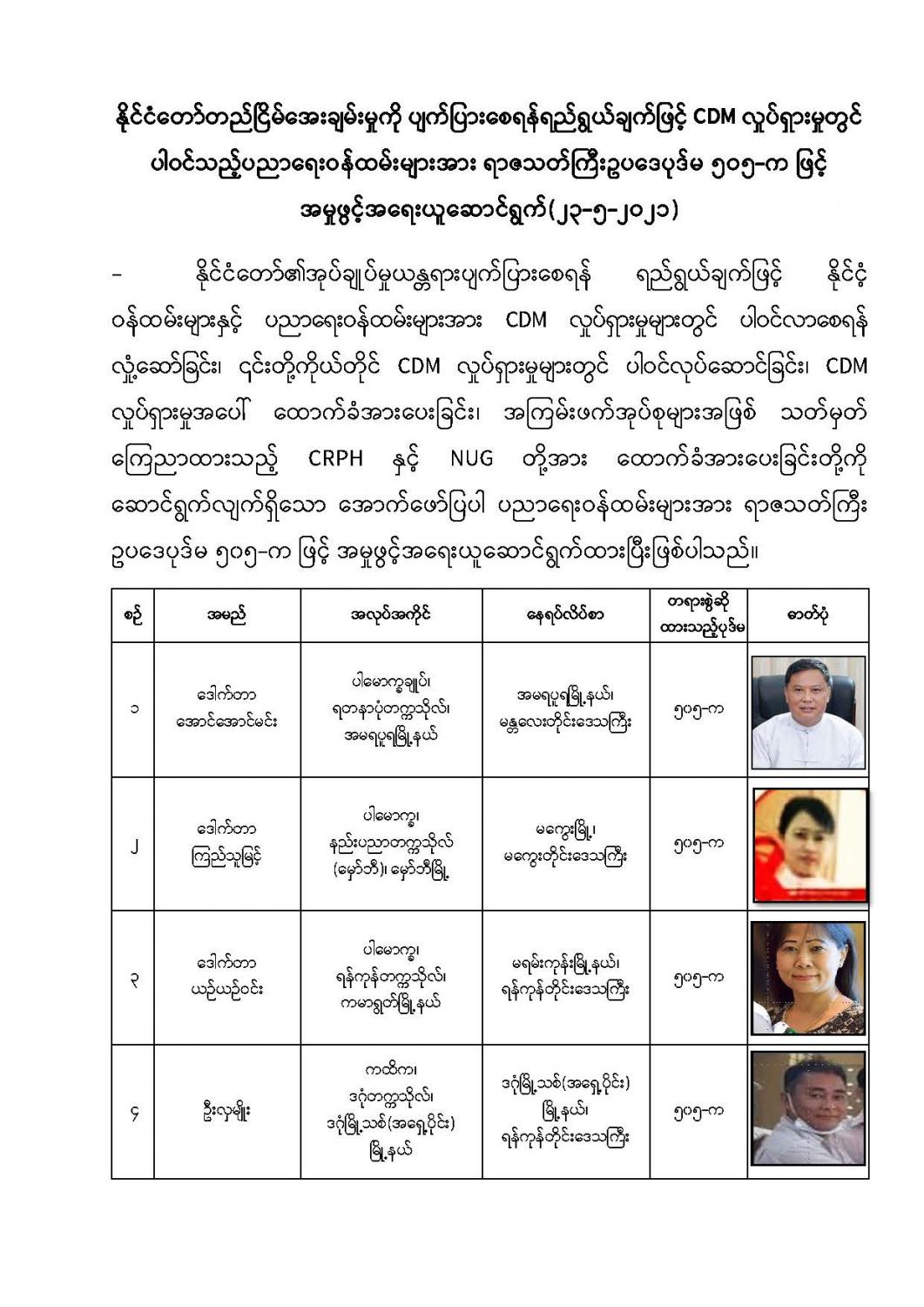 နိုင်ငံတော်တည်ငြိမ်အေးချမ်းမှုကို ပျက်ပြားစေရန်ရည်ရွယ်ချက်ဖြင့် CDM လှုပ်ရှားမှုတွင် ပါဝင်သည့်ပညာရေးဝန်ထမ်းများအား ရာဇသတ်ကြီးဥပဒေပုဒ်မ ၅၀၅-က ဖြင့် အမှုဖွင့်အရေးယူဆောင်ရွက်(၂၃-၅-၂၀၂၁) 05/23/2021