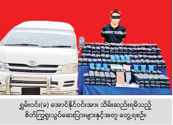 နေပြည်တော်၊ မေ ၂၃ ရှမ်းပြည်နယ်(တောင်ပိုင်း)၊ ရွာငံမြို့နယ်တွင် ငွေကျပ်သိန်း ၄,၀၀၀ တန်ဖိုးရှိ စိတ်ကြွ ရူးသွပ် ဆေးပြား ၈ သိန်း ဖမ်းဆီးရမိခဲ့ကြောင်း မြန်မာနိုင်ငံရဲတပ်ဖွဲ့မှ သိရသည်။ ဖြစ်စဉ်မှာ မူးယစ်ဆေးဝါးတားဆီးနှိမ်နင်းရေးရဲတပ်ဖွဲမှ တပ်ဖွဲ့ဝင်များပါဝင်သော ပူးပေါင်း အဖွဲ့သည် မေ ၂၂ ရက် ညနေ ၃ နာရီခွဲတွင် ရှမ်းပြည်နယ်(တောင်ပိုင်း)၊ ရွာငံမြို့နယ်၊ ယုန်တောင် ကျေးရွာအနီး ရွာငံမှ ကျောက်ဆည်မြို့နယ်၊ ဟံမြင့်မိုရ်ဘက်သို့ ရွှမ်းဝင်း(ခ) အောင်နိုင်ဝင်း(၃၉)နှစ် မောင်းနှင်လာသည့် Toyota Hiace ယာဉ်ကို သတင်းအရရှာဖွေရာ ဒေသကာလတန်ဖိုး ငွေကျပ်သိန်း ၄,၀၀၀ တန်ဖိုးရှိ စိတ်ကြွရူးသွပ်ဆေးပြား ၈၀၀,၀၀၀ သိမ်းဆည်းရမိခဲ့ကြောင်း၊ စစ်ဆေးပေါ်ပေါက် ချက်အရ သိမ်းဆည်းရမိသော စိတ်ကြွရူးသွပ်ဆေးပြားများအား ရှမ်းပြည်နယ်(အရှေ့ပိုင်း)၊ တာချီ လိတ်မြို့နယ်မှ ကရင်ပြည်နယ်၊ မြဝတီမြို့နယ်သို့ သယ်ဆောင်ခြင်းဖြစ်ကြောင်း သိရှိရသဖြင့် ၎င်းအား မူးယစ်ဆေးဝါးနှင့်စိတ်ကိုပြောင်းလဲစေသောဆေးဝါးများဆိုင်ရာ ဥပဒေအရ အရေးယူထားရှိပြီး ကွင်းဆက်ပြစ်မှုကျူးလွန်သူများအား စစ်ဆေးဖော်ထုတ်လျက်ရှိကြောင်း သိရသည်။ (သတင်းစဉ်)