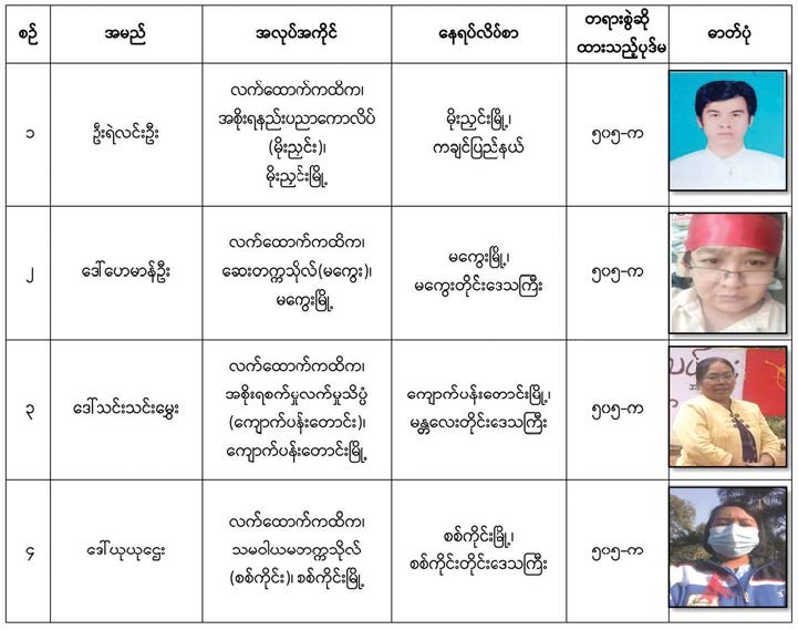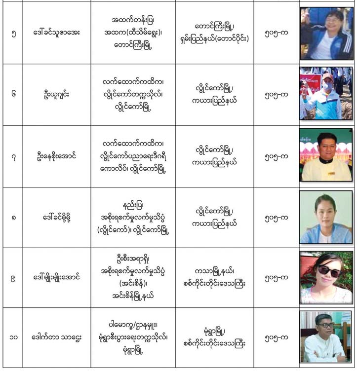 - အဆိုပါ အမှုဖွင့်လှစ်ထားသော ပညာရေးဝန်ထမ်းများအား ဖမ်းဆီးရမိရေး ဆောင်ရွက်လျက်ရှိပြီး ဖော်ပြပါ ပုဂ္ဂိုလ်များနှင့်စပ်လျဉ်း၍ နီးစပ်ရာရဲစခန်းများသို့ သတင်းပေးပို့ရန်နှင့် လက်ခံထားရှိသူများကိုလည်း တရားဥပဒေအရ အရေးယူ ဆောင်ရွက် သွားမည်ဖြစ်ကြောင်း အသိပေးကြေညာအပ်ပါသည်။