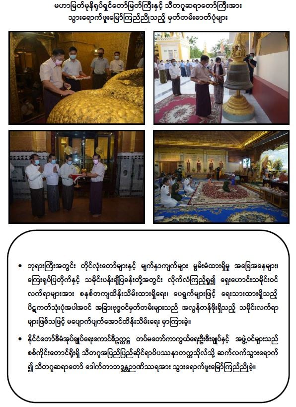နိုင်ငံတော်စီမံအုပ်ချုပ်ရေးကောင်စီဥက္ကဋ္ဌ၊ တပ်မတော်ကာကွယ်ရေးဦးစီးချုပ် ဗိုလ်ချုပ်မှူးကြီး မင်းအောင်လှိုင် မန္တလေးမြို့ ကျက်သရေဆောင် မဟာမြတ်မုနိရုပ်ရှင်တော်မြတ်ကြီး မွမ်းမံပြင်ဆင်မှု လုပ်ငန်းများအား ကြည့်ရှုစစ်ဆေးခြင်းနှင့် ဖူးမြော်ကြည်ညိုခြင်း