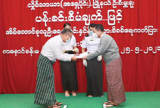 ပြည်ထောင်စုဝန်ကြီး ဦးဝင်းကြိုင် အိမ်ထောင်စုလူဦးရေစာရင်းနှင့် နိုင်ငံသားစိစစ်ရေးကတ်ပြား ပေးအပ် ပွဲတက်ရောက်