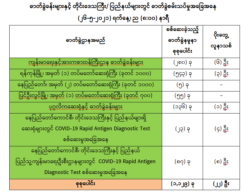 နေပြည်တော်ကောင်စီ၊ တိုင်းဒေသကြီးနှင့် ပြည်နယ်များရှိ ဆေးရုံများတွင် COVID-19 Rapid Antigen Diagnostic Test စစ်ဆေးမှုအခြေအနေ (၂၃) ခု (၄) ဦး နေပြည်တော်ကောင်စီ၊ တိုင်းဒေသကြီးနှင့် ပြည်နယ် ပြည်သူ့ကျန်းမာရေးဦးစီးဌာနများတွင် COVID-19 Rapid Antigen Diagnostic Test စစ်ဆေးမှုအခြေအနေ (၈၇) ခု (၈) ဦး