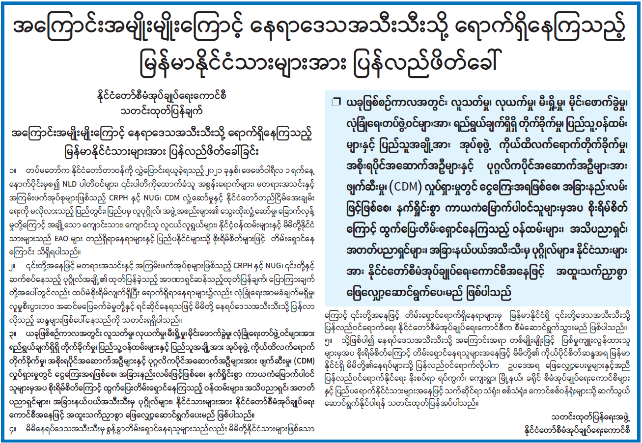အကြောင်းအမျိုးမျိုးကြောင့် နေရာဒေသအသီးသီးသို့ ရောက်ရှိနေကြသည့် မြန်မာနိုင်ငံသားများအား ပြန်လည်ဖိတ်ခေါ် 05/28/2021